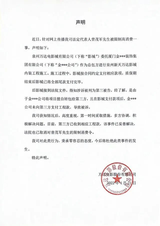 声明称,该公司获知情况后,高度重视,第一时间采取措施,多方协调,积极解决问题。目前,第三方已收到相应工程款,该事件已妥善解决,法院也已取消对曾茂军先生的限制消费令。万达电影表示,对此类行为,秉承零容忍的态度,今后将杜绝此类事件的发生。