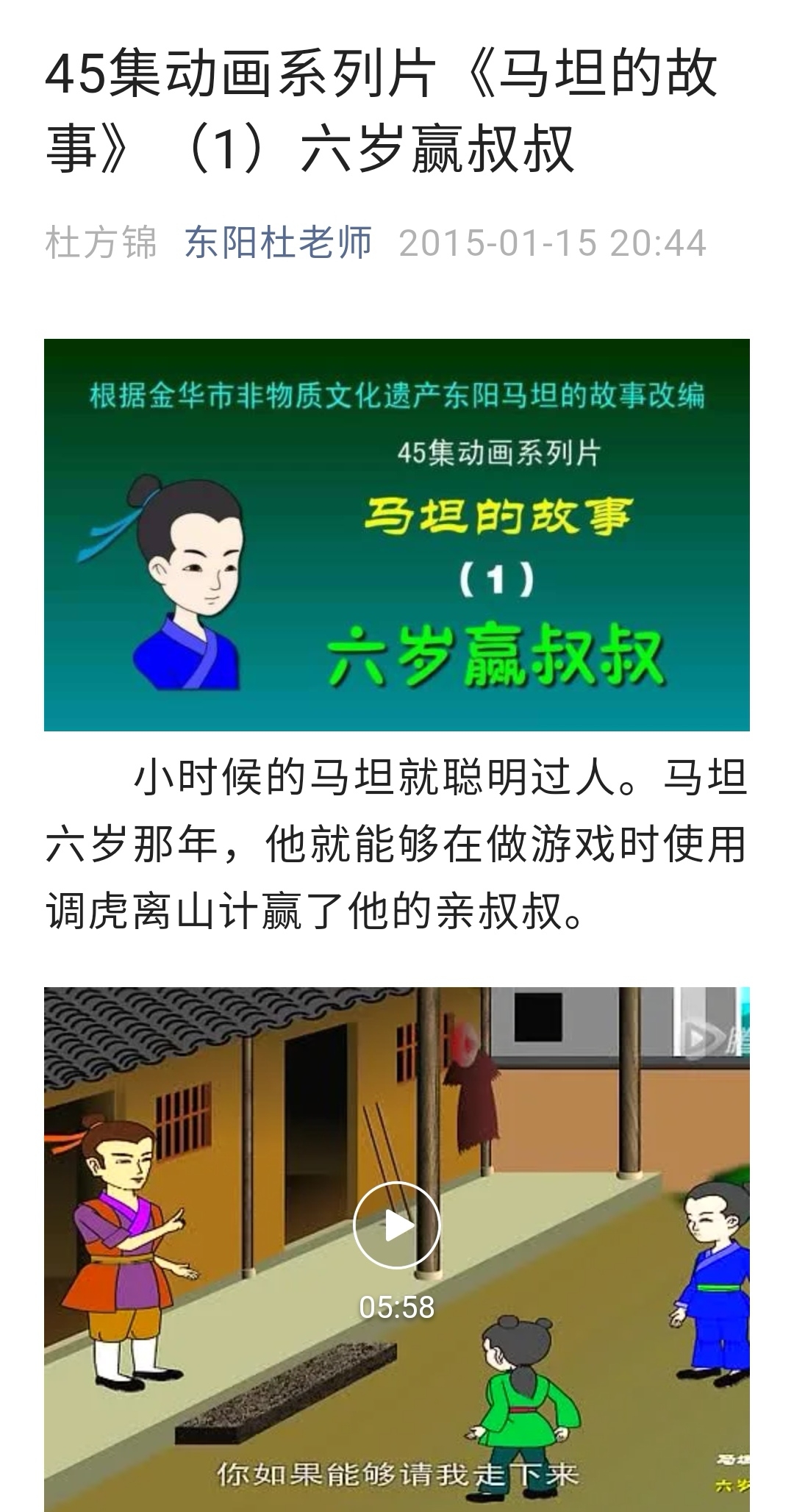 随着动画技法日趋成熟,杜方锦便萌生了把东阳经典民间故事做成系列动画片的念头。2008年,他开始尝试制作动画片《马坦的故事》。马坦是智慧的化身,有“东阳阿凡提”之称。杜方锦从小就喜欢听马坦的故事。这次选择用新技术传播东阳乡土文化,他非常用心,投入大量精力,还邀请当地文化艺术界的朋友一起参与制作。其中,动画设计制作由杜方锦一个人承担。“工作量很大,我花了两年多时间,直到2011年才完成。”据了解,动画片《马坦的故事》总共45集,有普通话和东阳方言两个版本,一经推出,好评如潮。