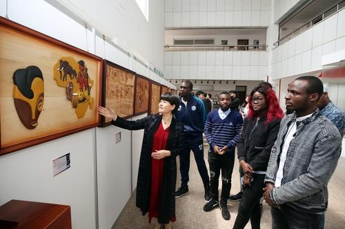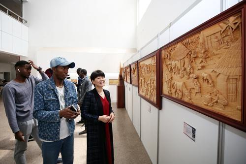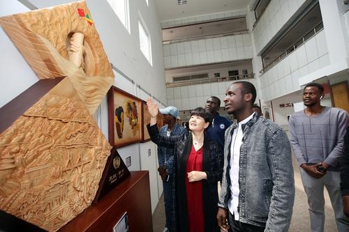 5月16日,东阳市浙江广厦建设职业技术大学艺术设计学院大厅内,各种题材的木雕作品吸引了不少学生前来参观,该校“雕刻艺术设计国际班”的非洲留学生用中文流利的为前来观展的师生们讲述他们创作的想法、历程以及每幅作品代表的含义。据了解,今年是刚果(布)留学生来广厦大学学习木雕创作的第4年,为展示他们这几年的学习成果,该校特地为非洲留学生举行了木雕作品展。展出的作品主要分中刚友谊、非洲风土人情、人与自然和谐发展三大板块。刚果(布)文化融入东阳木雕,更是丰富了东阳木雕的创作题材和内涵,也使得东阳木雕设计有了洋视角。