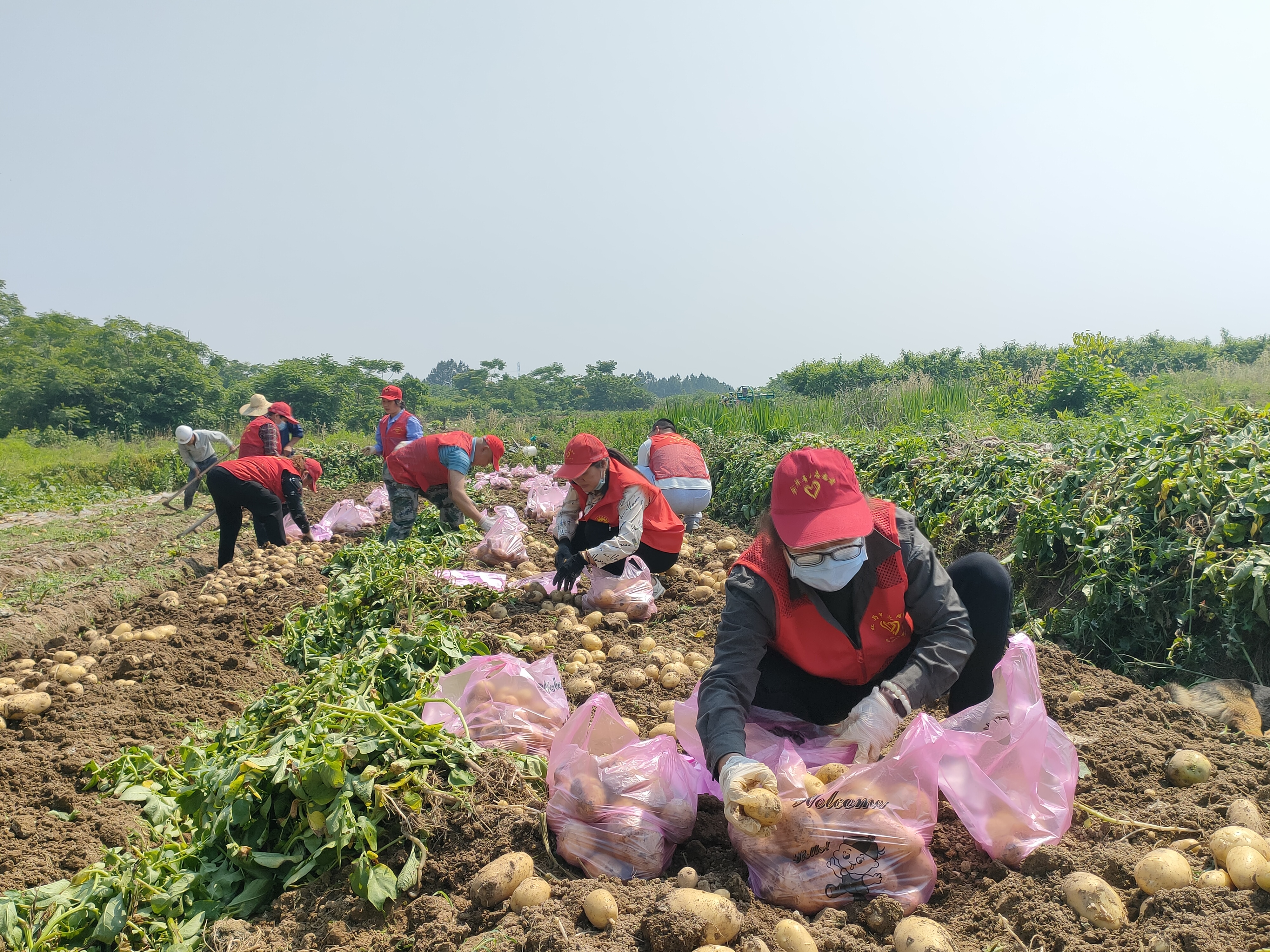 在熟人的引荐下,徐坚强向金东区曹宅社工站求助。社工郑秀华立即组织社工和志愿者进行爱心义卖,一天销售1500多公斤土豆。考虑到天气等因素,曹宅社工站决定加快义卖节奏,帮忙链接各方资源,搭建挖销一条龙平台。