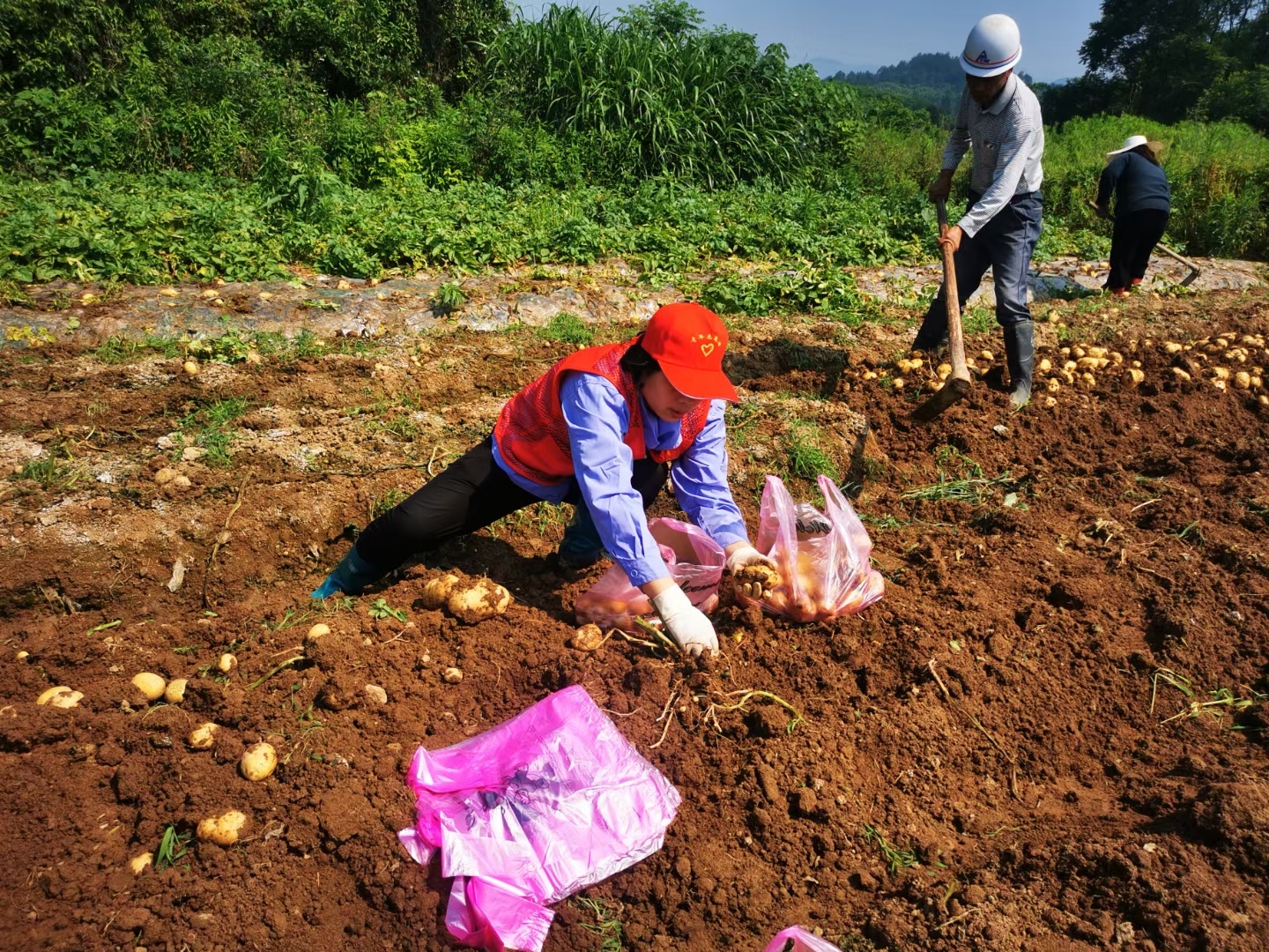 爱心订单接踵而至,土豆来不及挖。阮尚军的一些亲戚向单位请假,纷纷来帮忙挖土豆,依然供不应求。双尖山救援队的队员赶来,挥舞起锄头,将一颗颗土豆从土里挖出,装入袋中。17日,金东区大脚印公益服务中心的8名志愿者也来挖土豆,今年66岁的徐银妹是其中一员,她小心翼翼地从土豆秧旁下锄,尽量不将土豆挖破,她笑称自己退休后过上了面朝黄土背朝天的生活。“干农活虽然累,但土豆如果烂在地里很可惜,帮助别人是一件快乐的事。”徐银妹说。