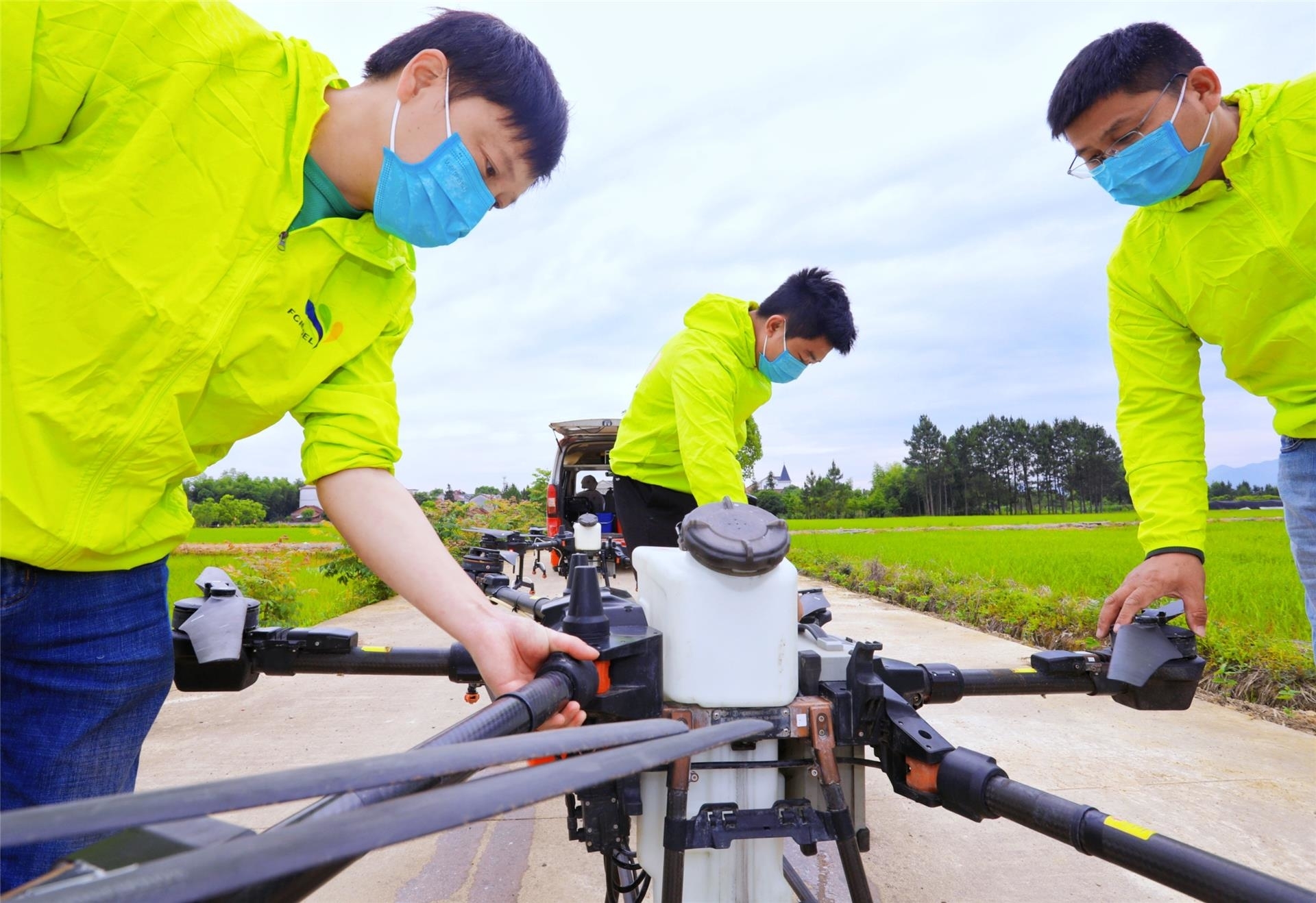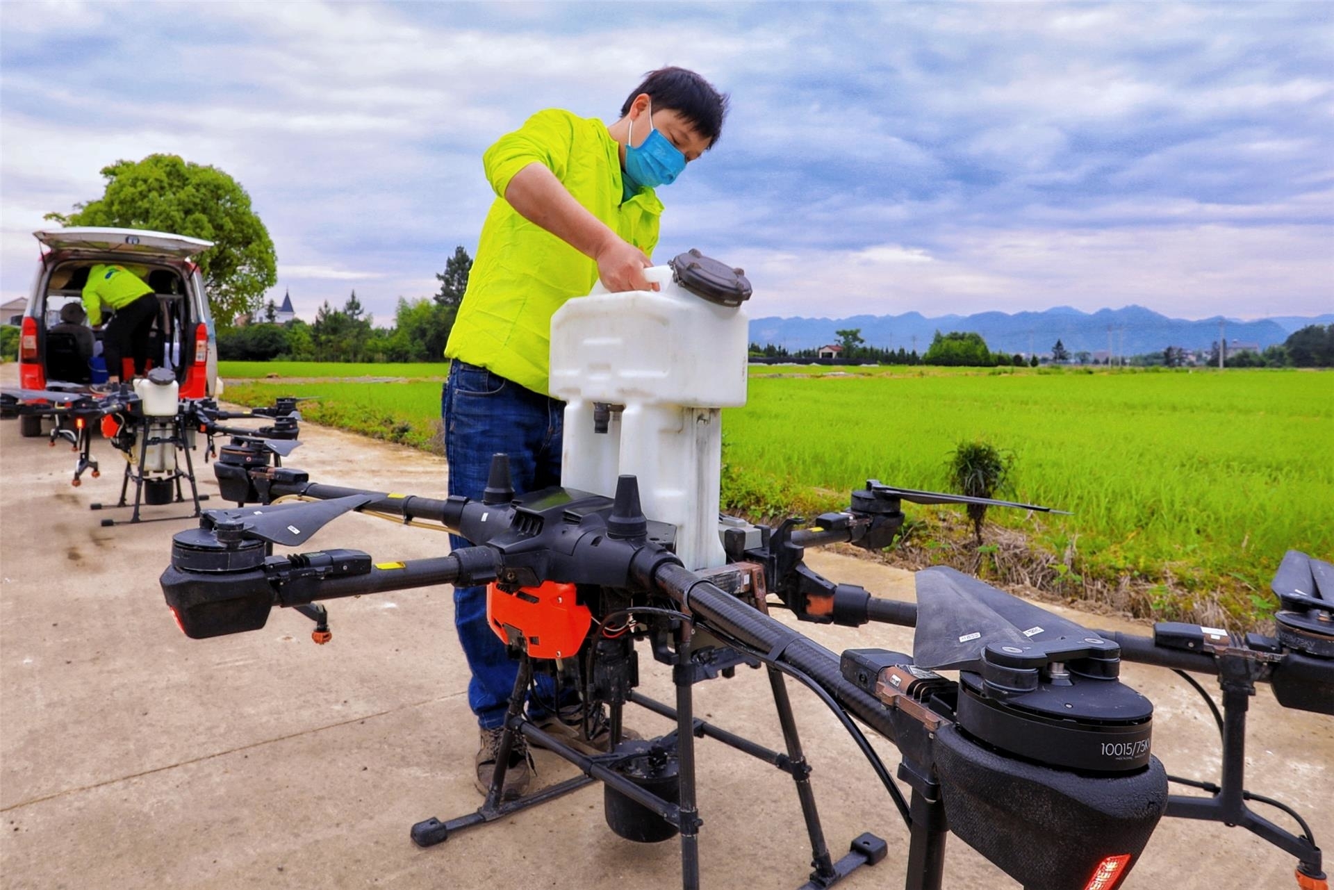 5月19日清晨,婺城区琅琊镇杨塘背村的稻田上空,2架喷洒农药的无人机正在来回移动。在喷洒现场,记者看到飞防技术人员站在水稻地旁,一边操纵着遥控器,一边仔细观察无人机的洒药轨迹,短短几分钟,便完成了一亩水稻的喷洒任务。