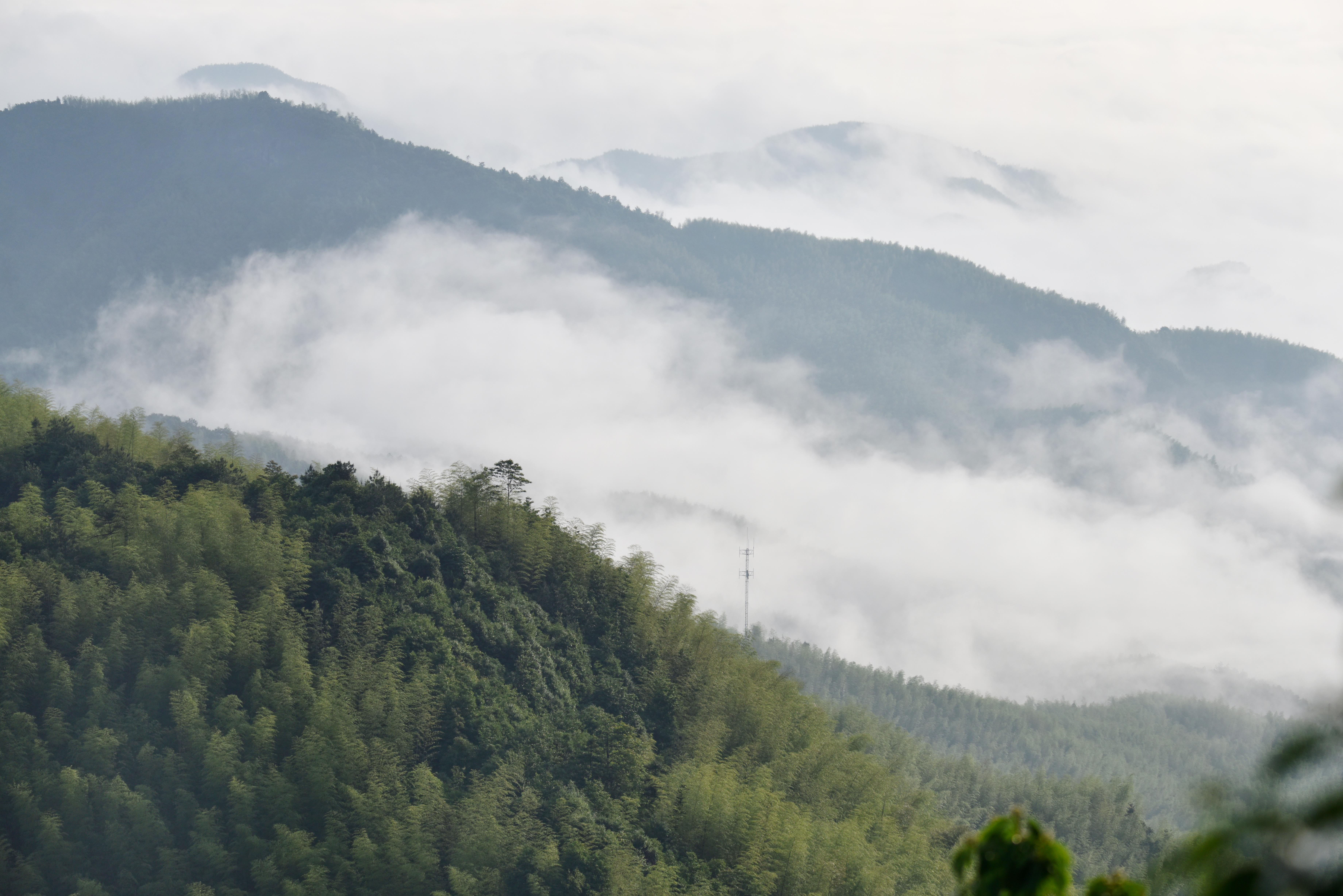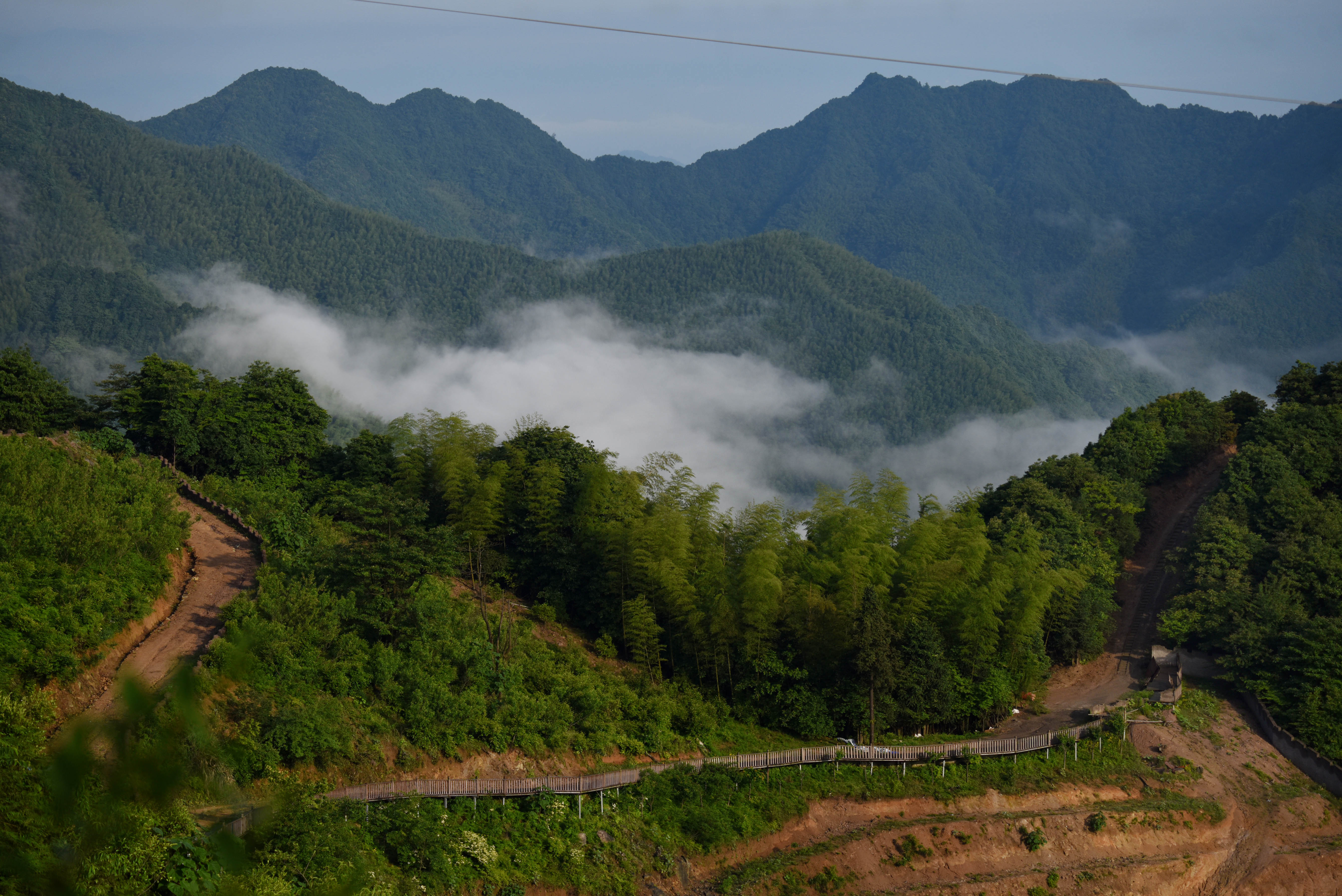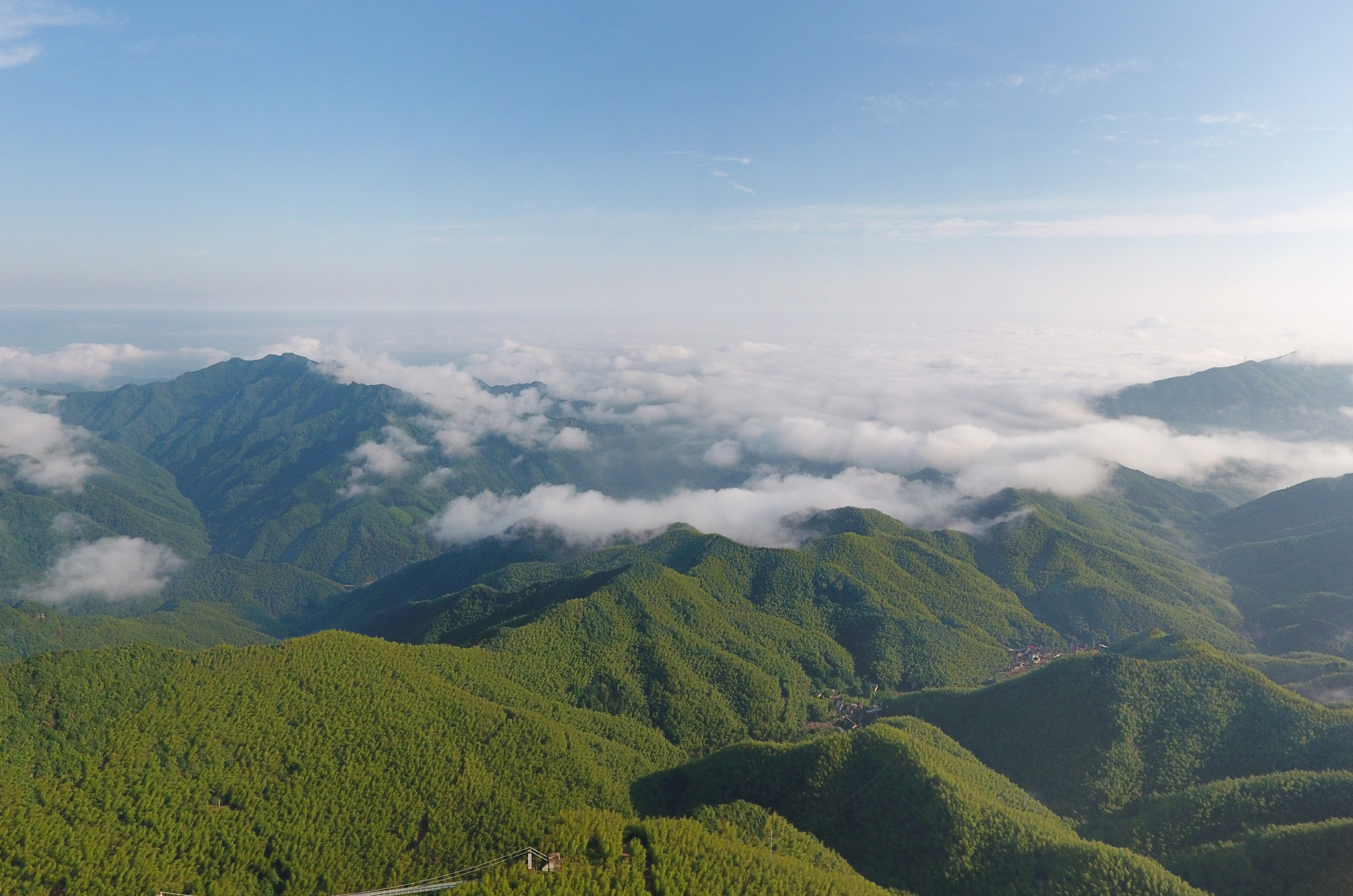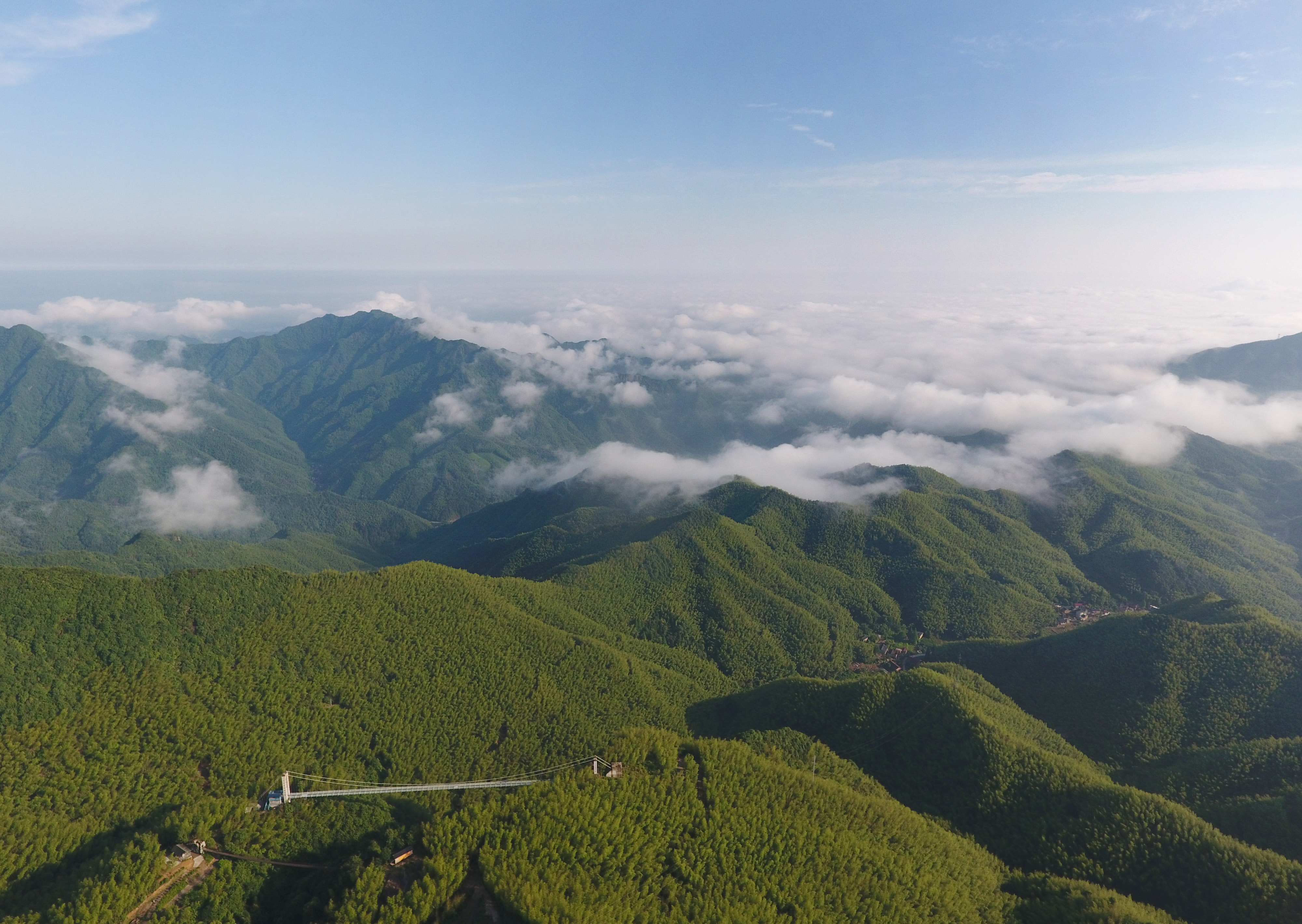 5月25日,俯瞰武义县千丈岩山巅,云雾缭绕、翠竹摇曳、宛如仙境。