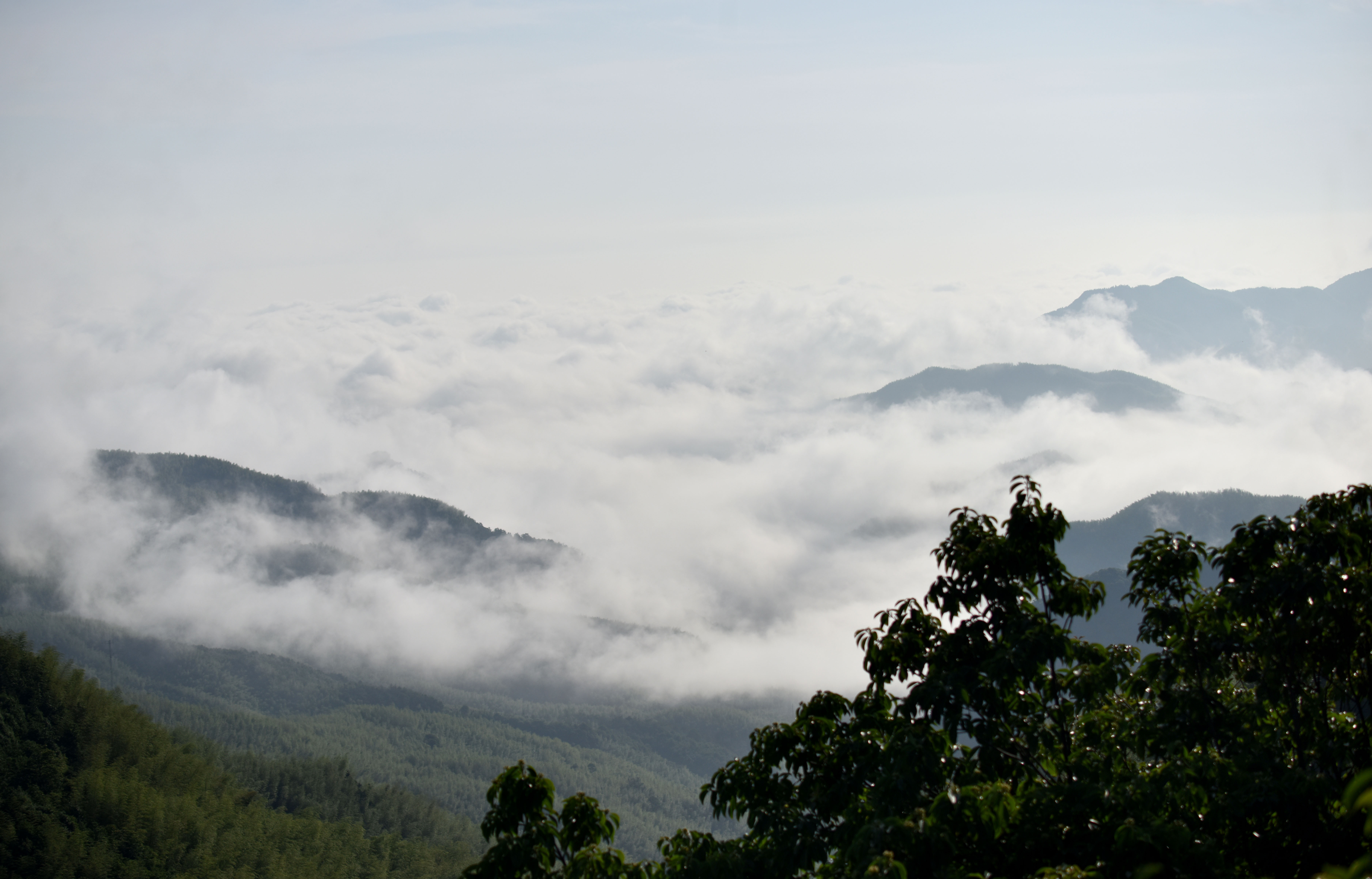 武义县千丈岩位于武义缙云交界的山巅上,海拔960多米,有万亩竹海。当日雨后放晴的千丈岩山巅上壮观的云海像海浪一样在万亩竹海上空翻滚,景色甚美。