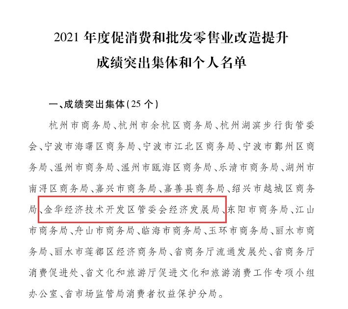 近日,浙江省人民政府办公厅发文,对2021年度促消费和批发零售业改造提升成绩突出集体和个人予以通报表扬,金华开发区经发局榜上有名。