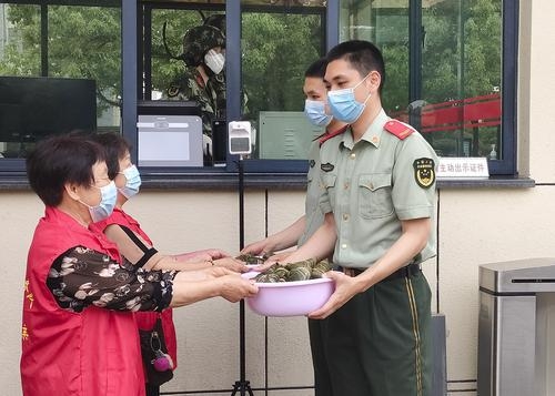 5月31日,婺城区城中街道杨思岭社区新时代文明实践站“马奶奶拥军服务队”成员来到武警金华支队勤务保障大队警勤中队,给站岗执勤官兵送去自己包的端午节粽子,共叙军民鱼水之情。 武警官兵邀请阿姨们端午节到部队食堂,教新来的士兵包粽子技巧,阿姨表示乐意帮忙,让官兵学习传统手艺。据了解,警勤中队与杨思岭区军民共建已经30多年,有着军爱民、民拥军的光荣传统。