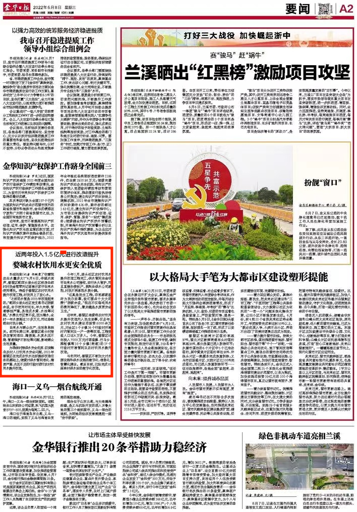 近年来,婺城区连续将农村饮用水提升改造列入婺城区民生实事之一。去年,婺城区农村饮用水建设总投资8000余万元,对全区5个乡镇16个行政村进行村内管网及一户一表等改造,工程受益人口6万多人。今年,婺城区计划投入7000万元,对蒋堂镇、竹马乡、雅畈镇等10个乡镇街道17个行政村进行管网及农村饮用水提升改造。