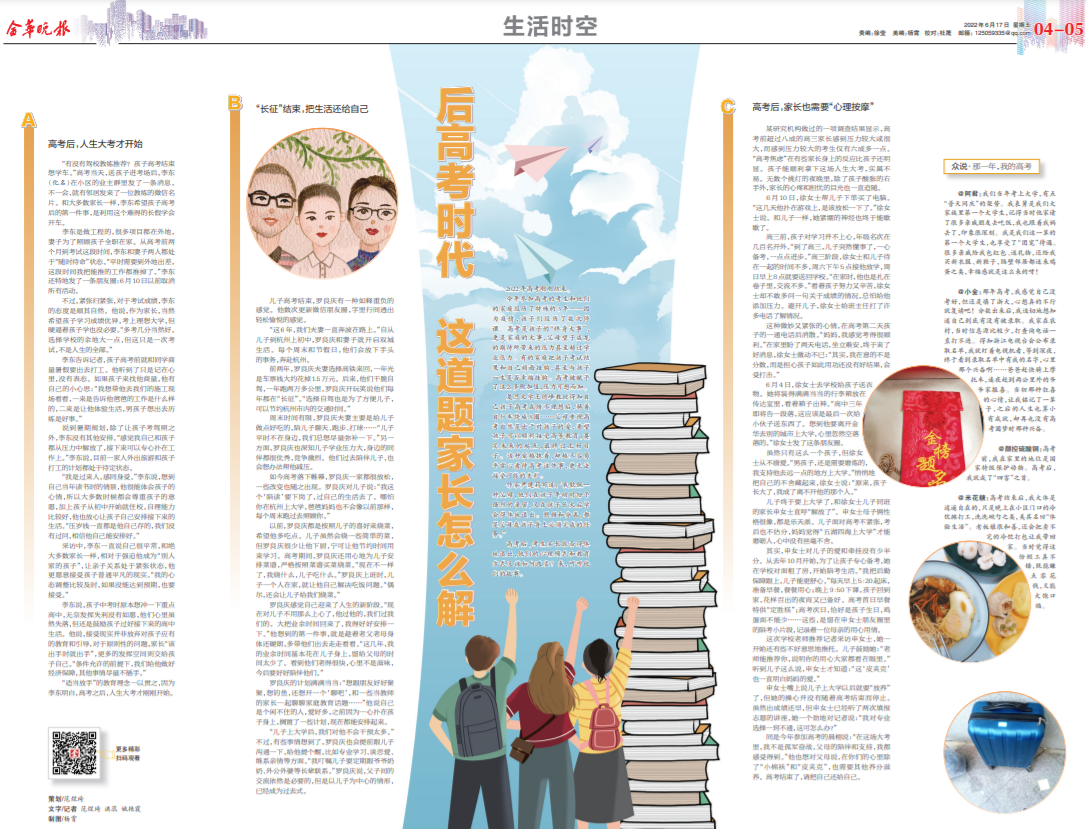 同是今年参加高考的晨栩说:“在这场大考里,我不是孤军奋战,父母的陪伴和支持,我都感受得到。”他也想对父母说,在你们的心里除了“小棉袄”和“皮夹克”,也需要其他养分滋养。高考结束了,请把自己还给自己。