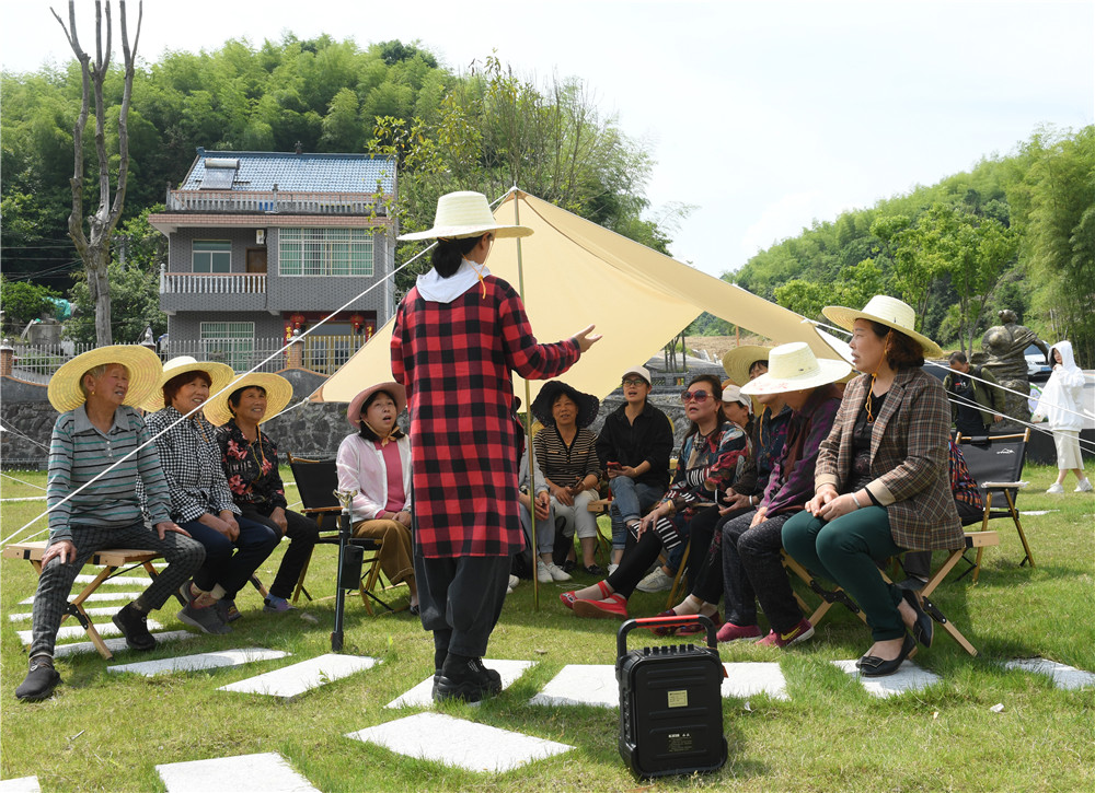 5月17日,在浙江省建德市航川村,“文艺村长”周霞(中)指导村民们进行声乐练习。该市在各镇街推行“文艺村长”工作制度,将有意愿的文艺工作者分派到农村开展教学。新华社记者 翁忻旸 摄