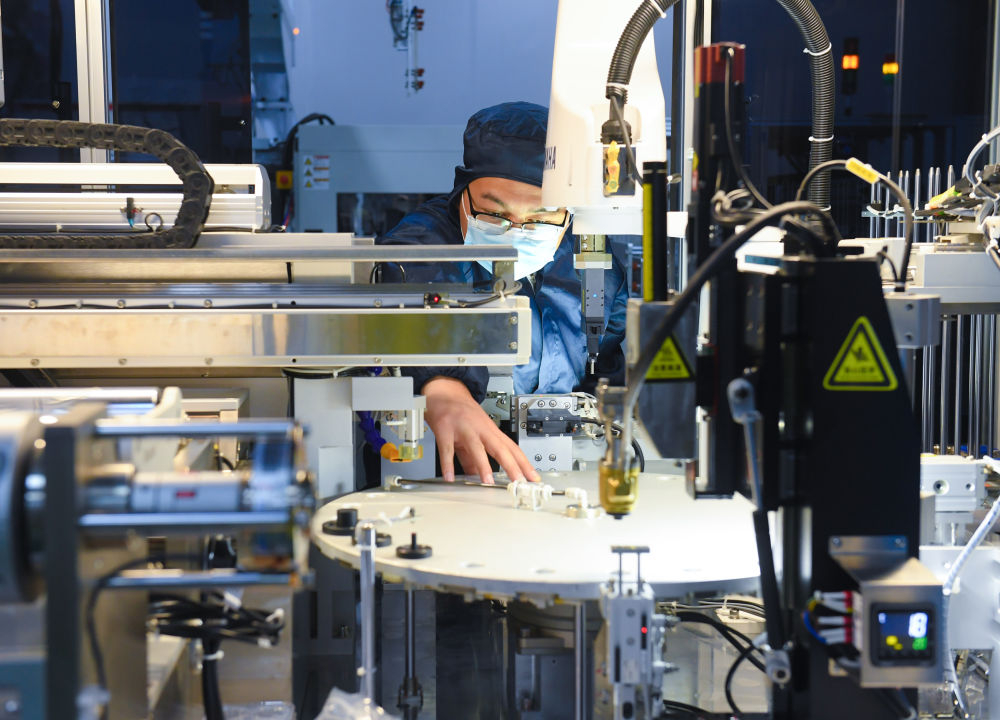 6月15日,在浙江省台州市仙居县一家医疗器械公司的生产车间,工作人员在调试生产线上的一套医学实验室设备。新华社记者 翁忻旸 摄