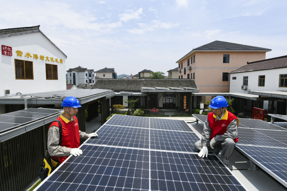 6月9日,电力工人在浙江省嘉兴市海盐县通元镇雪水港村文化礼堂的连廊上安装光伏发电板。新华社发