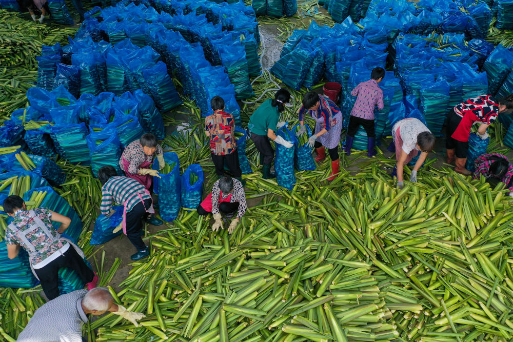 2021年8月25日,在浙江省丽水市景宁畲族自治县大漈乡大漈村茭白交易市场,村民将新收割的茭白打包冷藏(无人机照片)。新华社发(李肃人 摄)