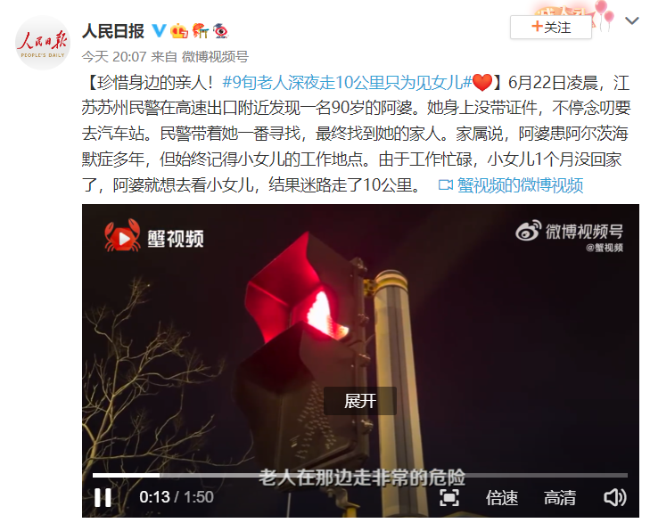 据人民日报客户端25日报道,6月22日凌晨,江苏苏州民警在高速出口附近发现一名90岁的阿婆。她身上没带证件,不停念叨要去汽车站。民警带着她一番寻找,最终找到她的家人。家属说,阿婆患阿尔茨海默症多年,但始终记得小女儿的工作地点。由于工作忙碌,小女儿1个月没回家了,阿婆就想去看小女儿,结果迷路走了10公里。
