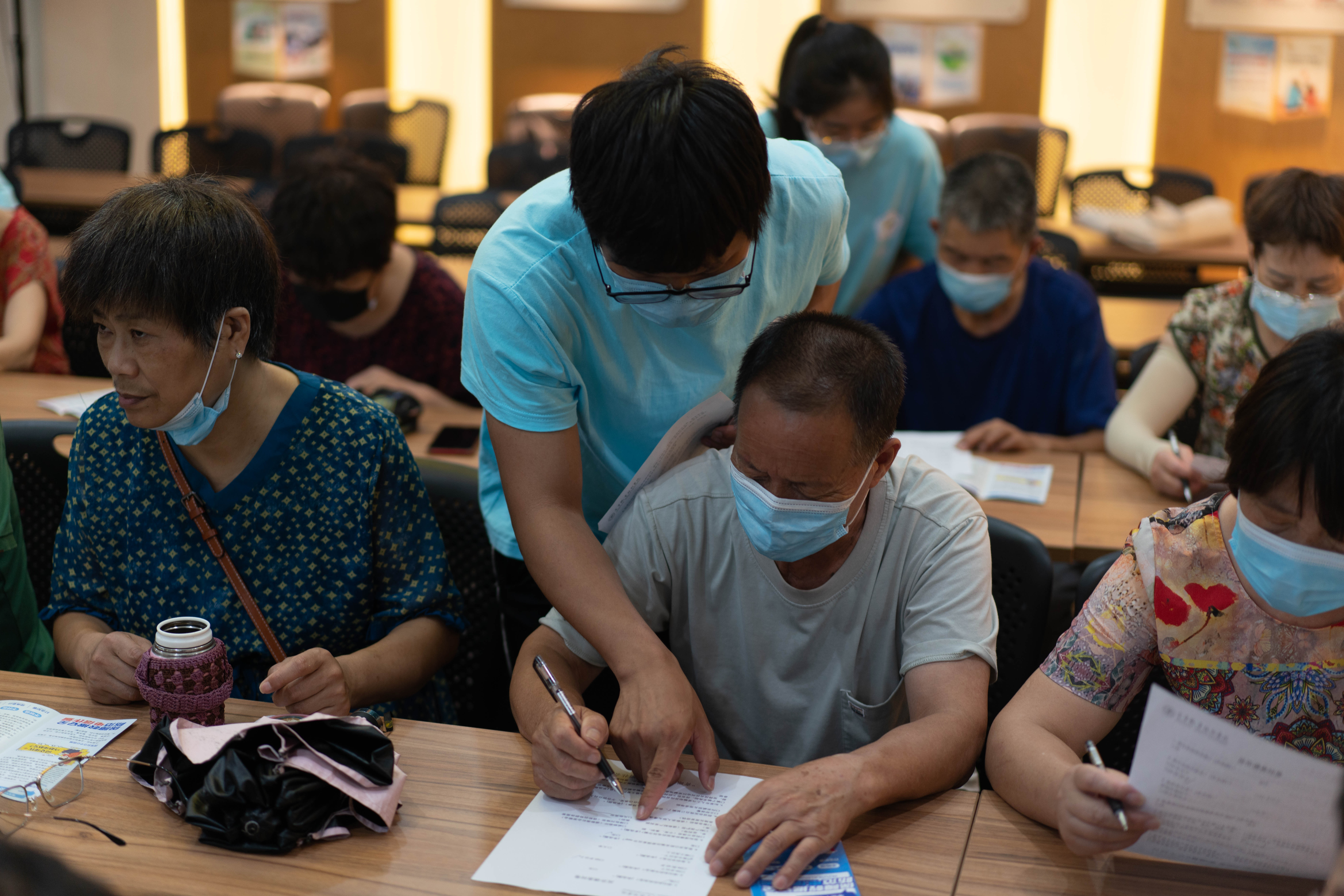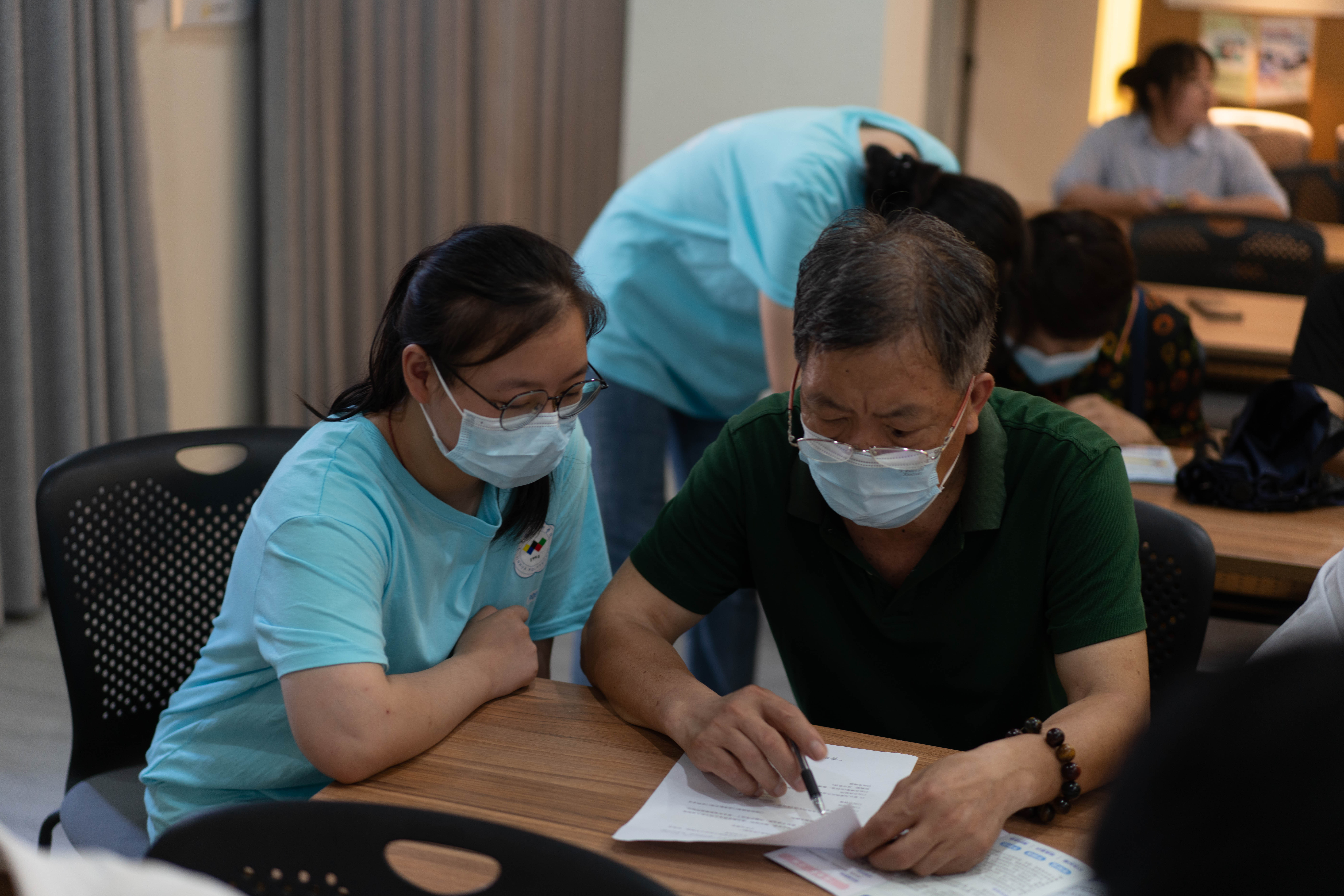 宣讲开始前,志愿者为社区居民发放了宣传册、反诈骗调查问卷。针对老年人,大学生志愿者贴心地为老人读题,方便他们填写反诈问卷。通过问卷,志愿者们进一步了解老人被骗的可能性,定位重点反诈人员,并通过鲜活的案例逐一讲解老年人容易上当受骗的电诈手法、作案特点,分享防信息泄露和防范电诈的技巧。同时,现场引导参与人员下载“国家反诈APP”开启来电,下载软件预警模式。