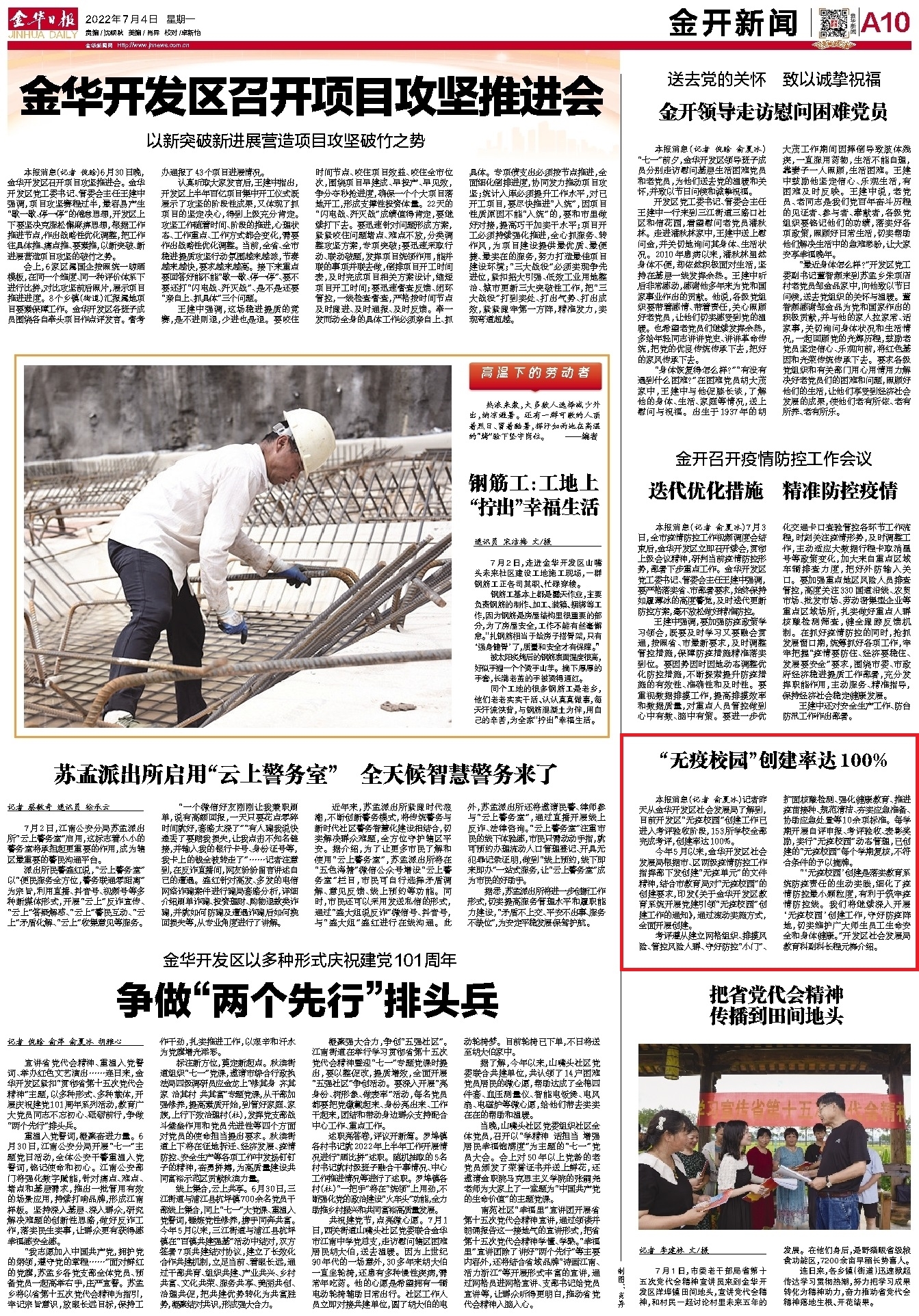 7月1日,记者从金华开发区社会发展局了解到,目前“无疫校园”创建工作已进入考评验收阶段,开发区153所学校已完成考评,创建率达100%。
