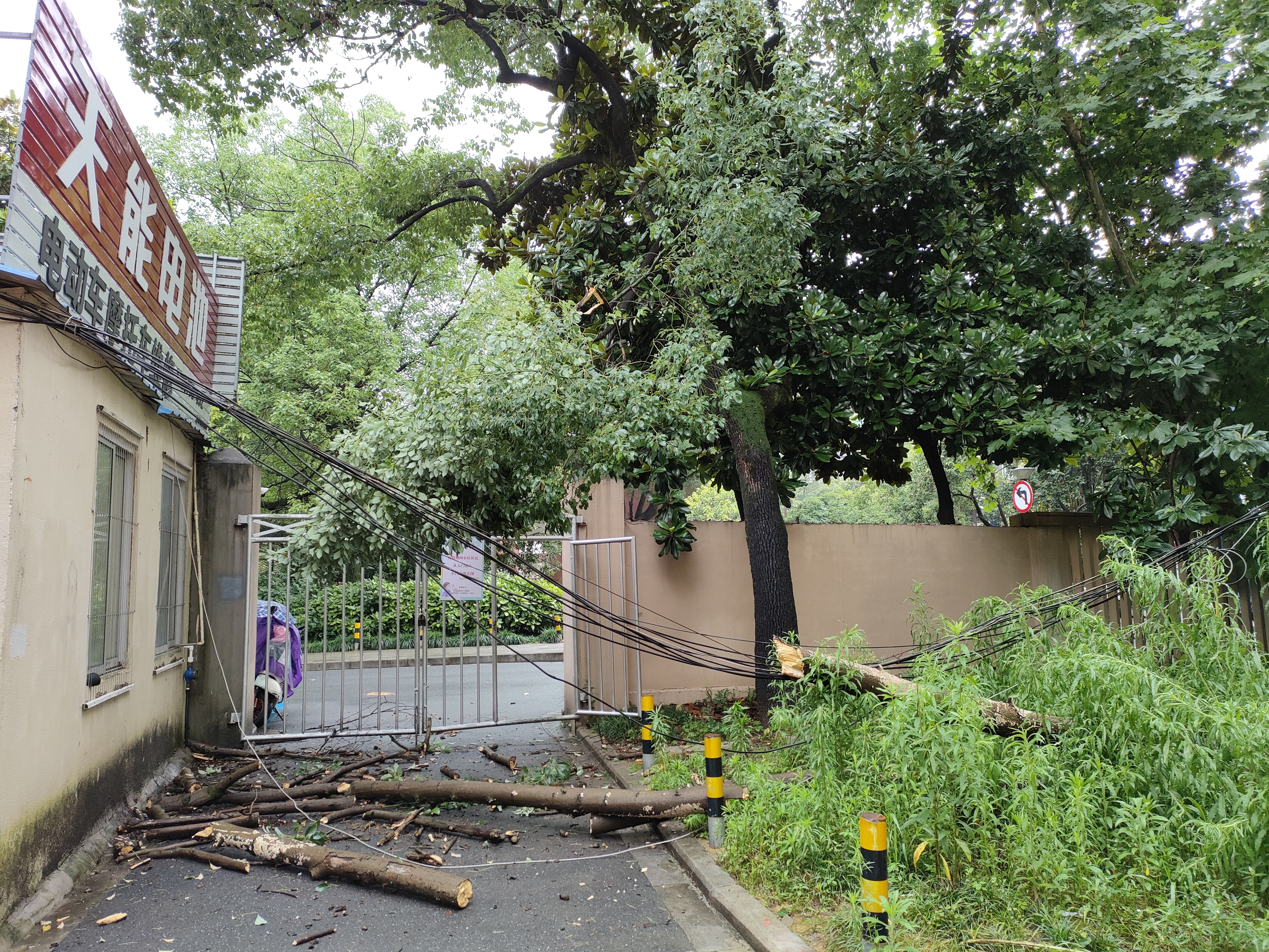 “阵雨多风大,枯树就倒了。”担心造成二次灾害,社区立即联系相关部门前来处理。压坏的线路属于移动运营商。晚上6点多,移动运营商派维修人员前来,由于人员不足,只对现场进行了简单处理。为保障安全,社区将南苑东22幢西门临时关闭。