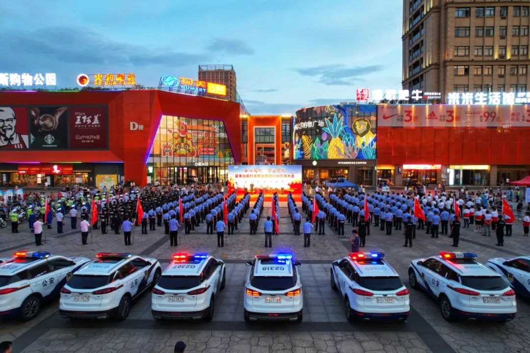 现场,旌旗猎猎、战鼓催征,各方阵整齐列队、士气昂扬,摩托车、警车排列有序、蓄势待发,集中展现了全面开启本次行动的强大攻势和坚定决心。
