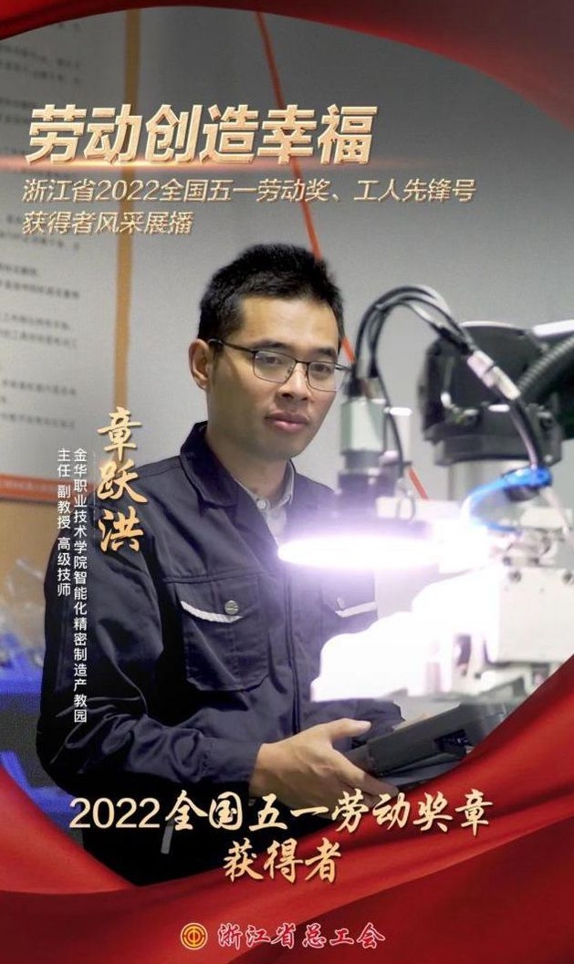 章跃洪现为金华职业技术学院产教园主任,曾获浙江省担当作为好干部、金华市劳动模范、全国技术能手、浙江省首席技师等荣誉。今年39岁的章跃洪当过8年的技术工人,做了14年的大学老师,从未离开过车间。他沉迷于技术,尽可能做到尽善尽美。