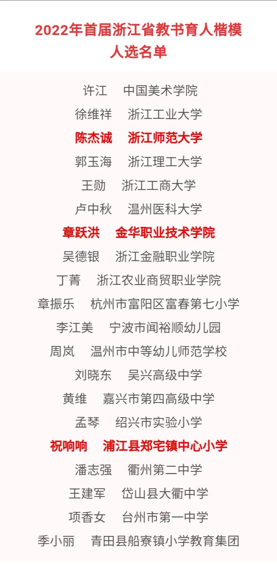 日前,省教育厅公示《2022年首届浙江省教书育人楷模选树人员名单》,20名优秀教师成为首届“浙江省教书育人楷模”。浙江师范大学教授陈杰诚、金华职业技术学院技术能手章跃洪、浦江县郑宅小学祝响响老师入围。