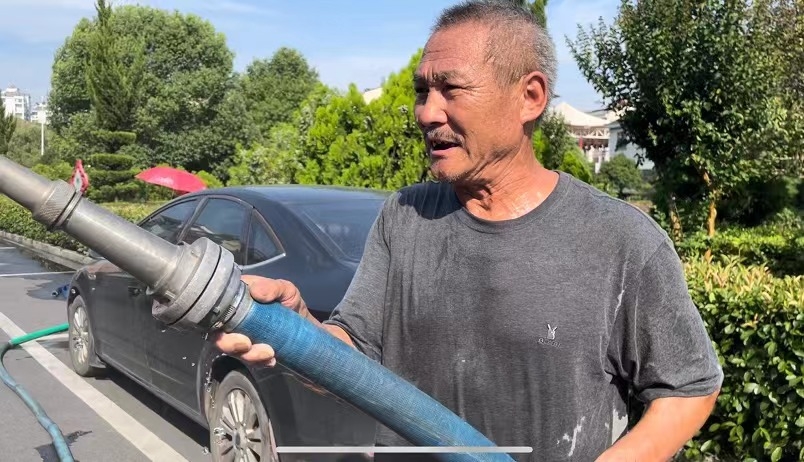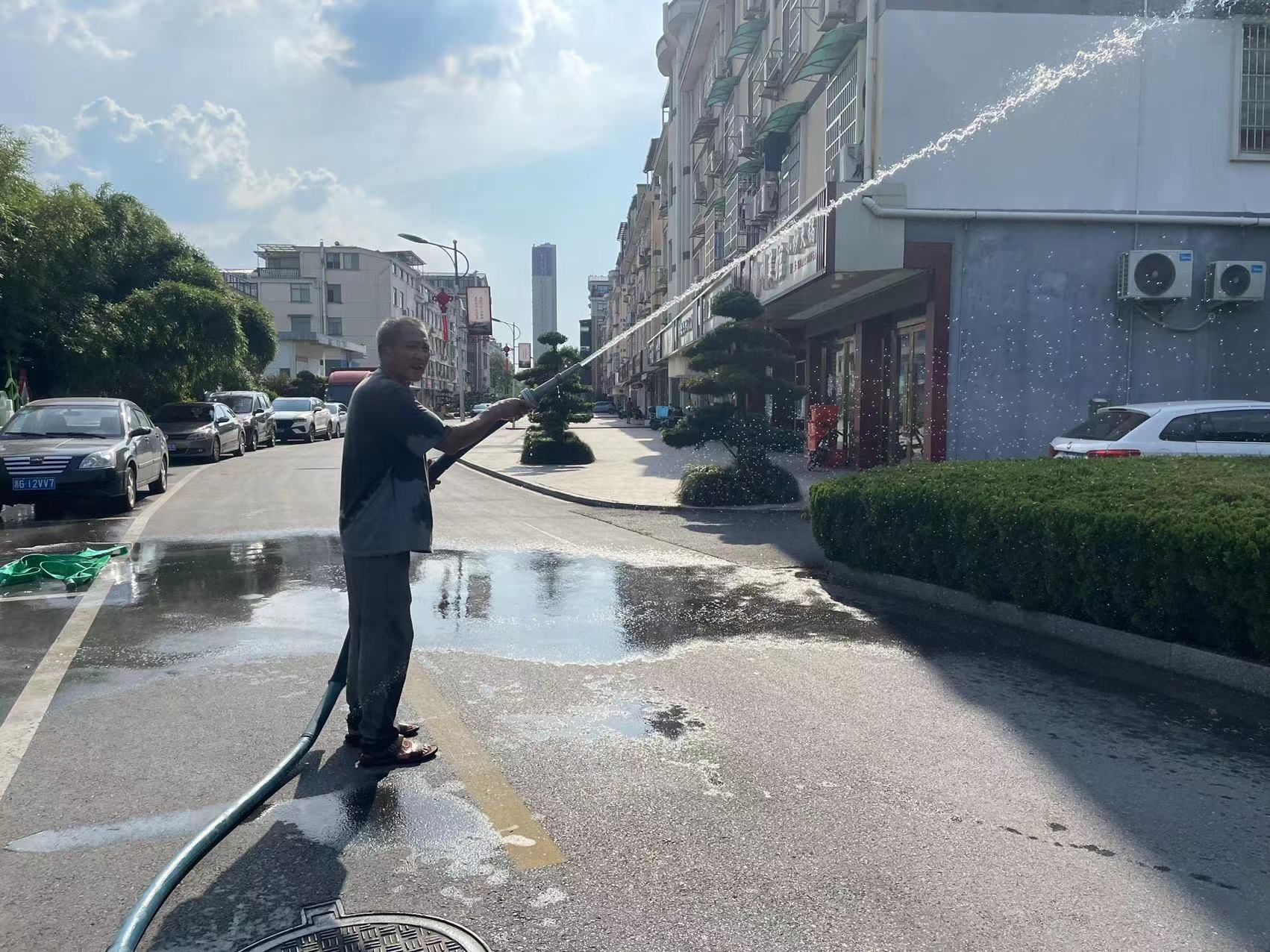 走近他,只见汗水几乎浸湿了整件上衣,其脸上的汗一个劲地往外冒,手里的活却一刻不停。这位护工叫盛庆林,在王坦社区当了8年的“花园大管家”了。夏季给植物浇水的最佳时间是上午或傍晚。这些天,金华的高温实在难耐。到了傍晚,体感温度还是很高。但盛师傅习惯了不戴任何防晒装备,就这样硬生生站在日头下,一站就是两个小时左右,稳稳地拿住分量不轻的水枪。“光站着可能比较好把握,但还要带着水枪移动位置。”水枪强劲的后坐力和他对抗着,盛师傅耐心地给一片片绿色的生命送上甘霖。从水管里喷射出的水落在滚烫的地面上,马上就冒起了“白烟”。记者站在他旁边几分钟后,就被晒得受不了。而每年的七、八两个最热的月份,除了下雨天,盛师傅几乎日日如此。