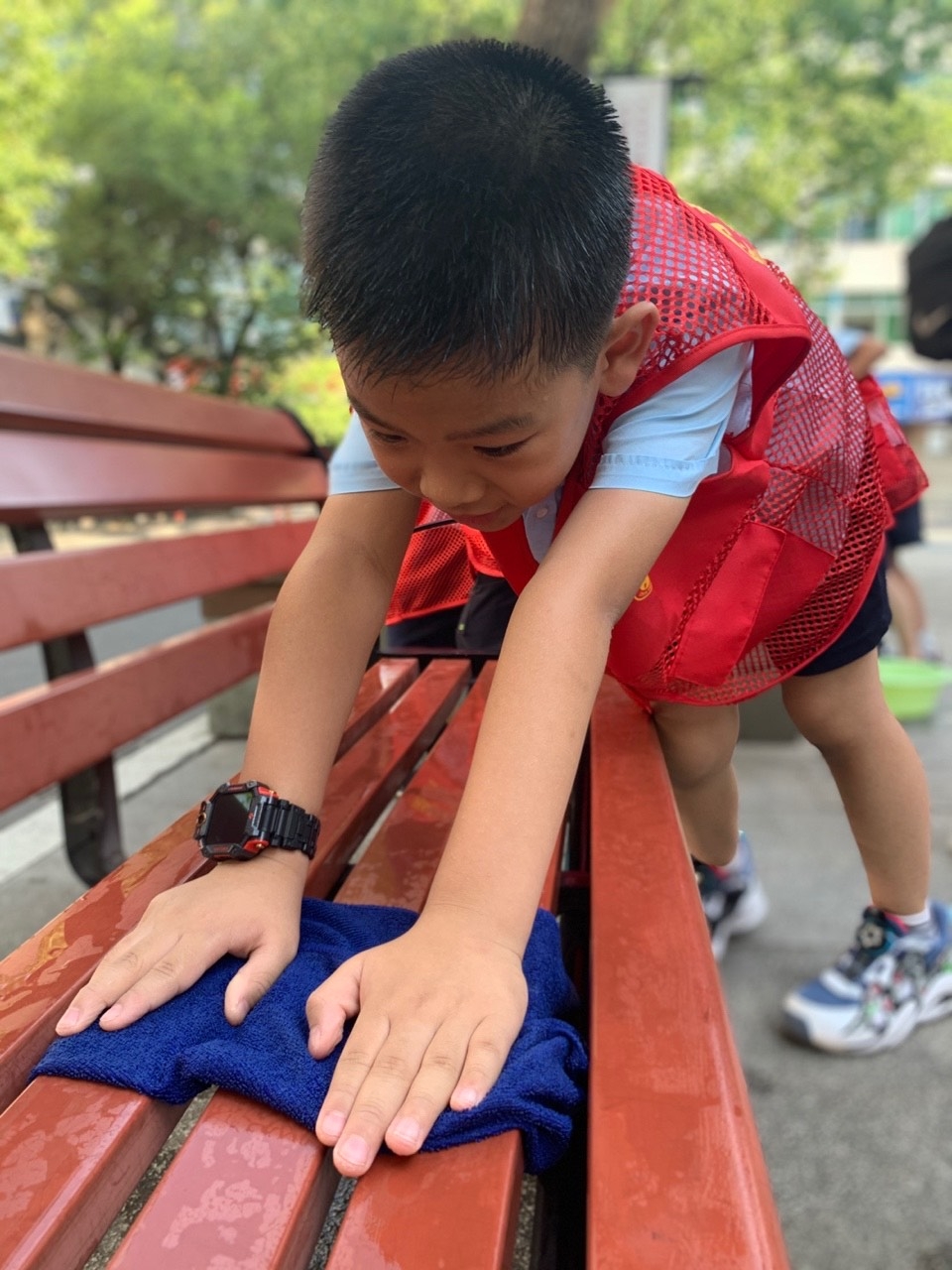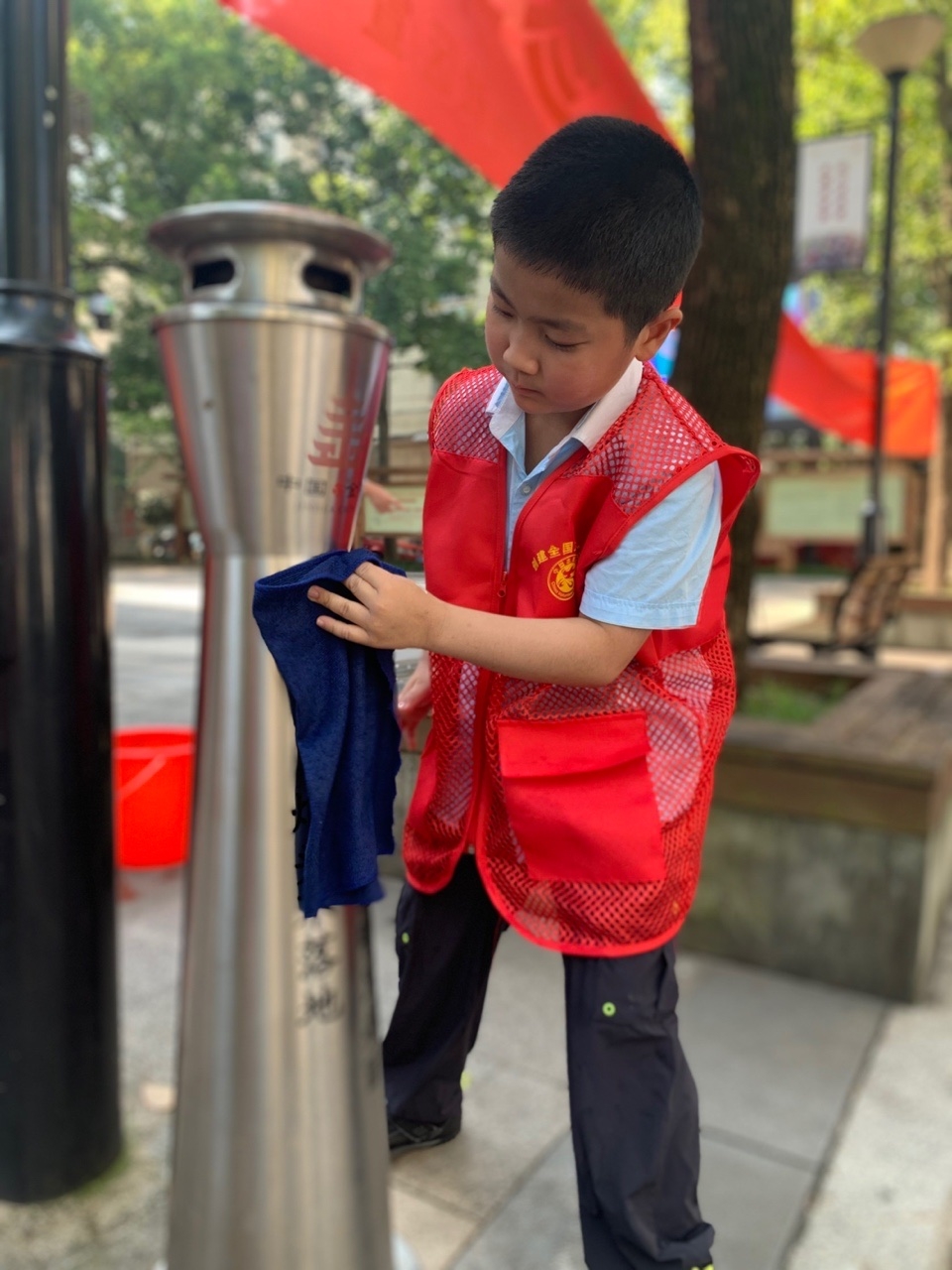 红领巾楼道长顶着烈日炎炎,认真清理枯枝、树叶、烟头、矿泉水等垃圾,并将社区内的宣传橱窗和长椅等擦拭得干干净净。近期金华持续高温,他们还对社区内垃圾分类点位的督导员进行了慰问,送上清凉饮料。收到小朋友提供的解暑饮料后,一线工作人员十分感动,脸上乐开了花。他们借此机会向孩子们讲解了智能垃圾分类投放点的使用技巧、垃圾分类的重要性与意义。