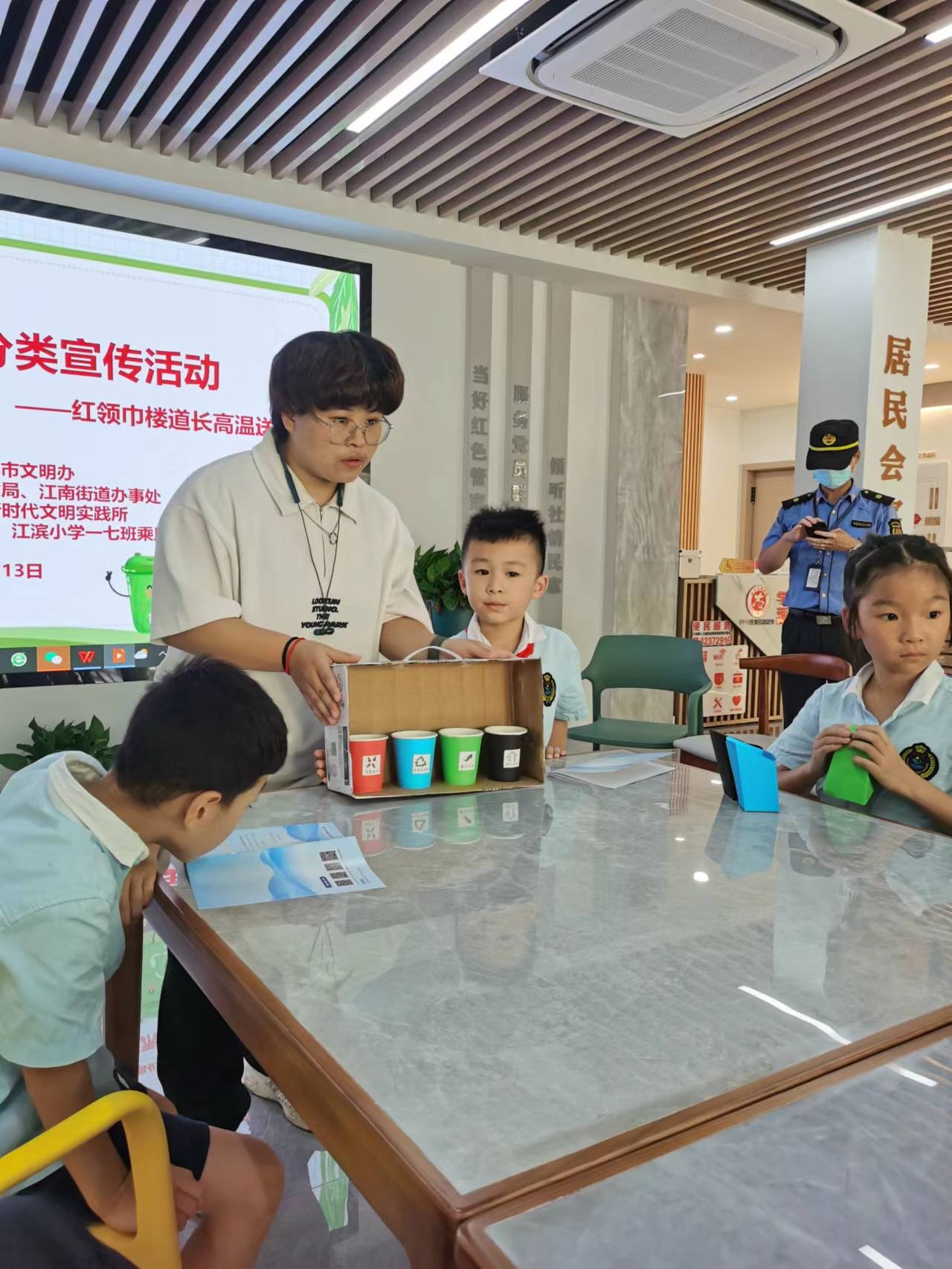 7月13日上午,“垃圾分类宣传——红领巾楼道长高温送清凉活动”在金华开发区江南街道南苑社区开展。江滨小学乘风破浪先锋队11对亲子家庭参加活动。