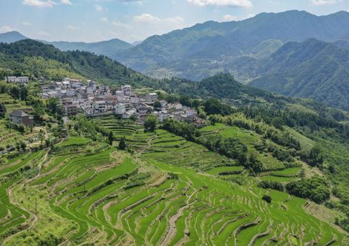 因岭边山坑村地势较高,常年气温相对较低,栽种中稻时间较晚,梯田中的秧苗在阳光的照耀下随风摇曳,长势喜人,一派生机勃勃的景象。从空中俯瞰,形状不一、浅绿深绿的梯田宛如绒毯一般铺满山间;蜿蜒曲折的田埂就像丝带一样缠绕着梯田,蔚为壮观。层层叠叠、高低错落的梯田与房屋、山峰、蓝天、白云构成一幅大自然的美丽画卷。