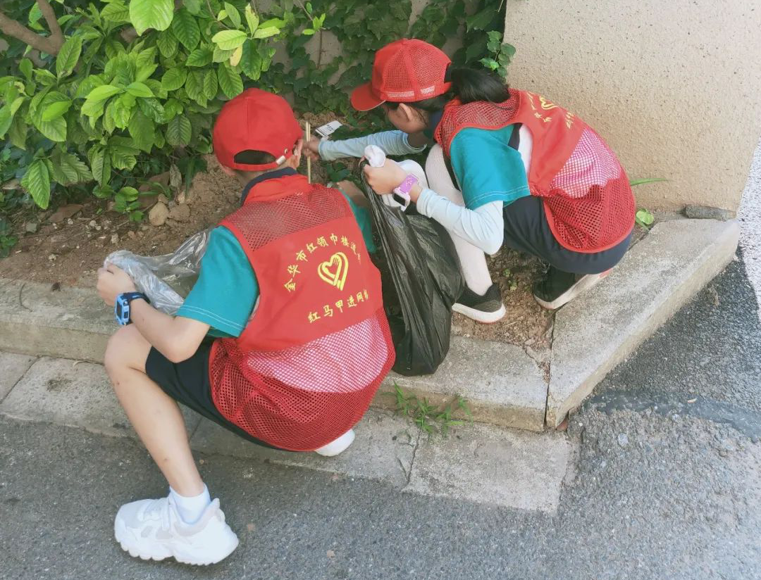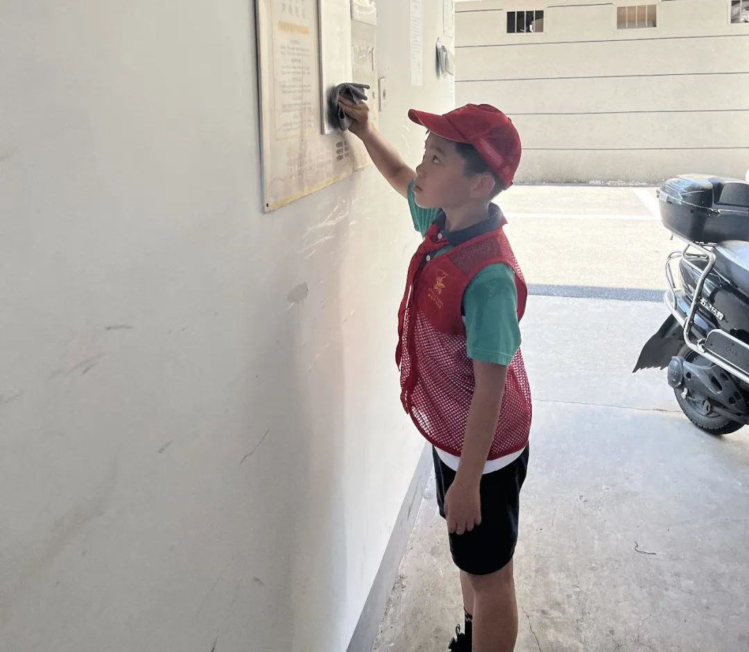 一块抹布、一把铲子、一把扫帚、一个水桶,尽管天气炎热,但红领巾楼道长们仍旧热火朝天地擦拭楼梯扶手、打扫地面、捡拾烟头、整理车棚、清洁卫生死角……干得很认真。