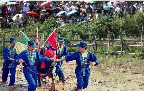 平日里悉心照料不说,赛前更是要精心准备大餐,佐以黄酒一同喂给牛吃。上场前,牛主人还会提前商量好,将性格温和的牛和性格刚烈的牛配对,以免两头气急的牛互斗而受伤,而性格温和的牛常能以柔克刚。