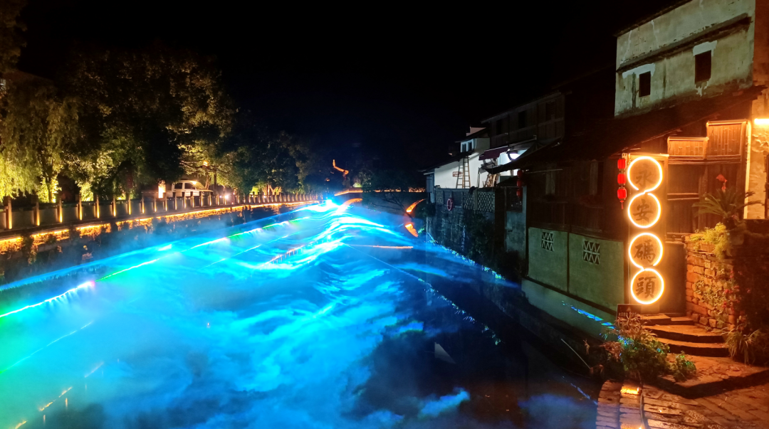 视觉盛宴的精彩呈现也离不开灯光的加持。今年以来,游埠古镇积极整合并打造古镇夜游基础亮化,在夜游场景中引进了5G技术、裸眼3D技术、数字互动等技术,提升了沿溪两岸夜游水景灯光景观氛围。在灯光的作用下,整场演出氛围感简直拉满。