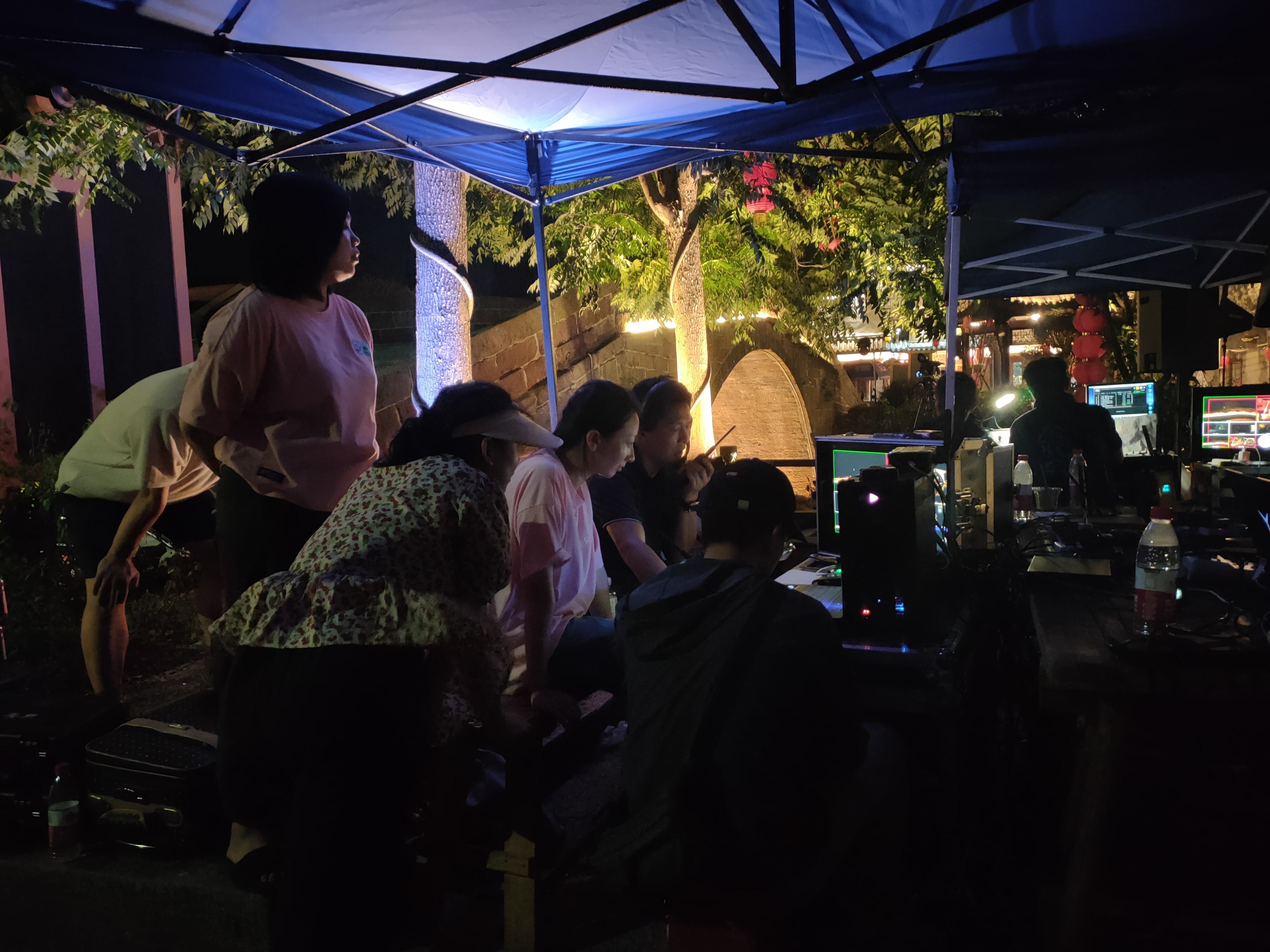 随后,又见几名少女执扇提灯,从远处缓缓走来,她们来到岸边的一座露天茶座,与友人相会。等候多时的友人早已备下糕点,等待一同泛舟夜游。