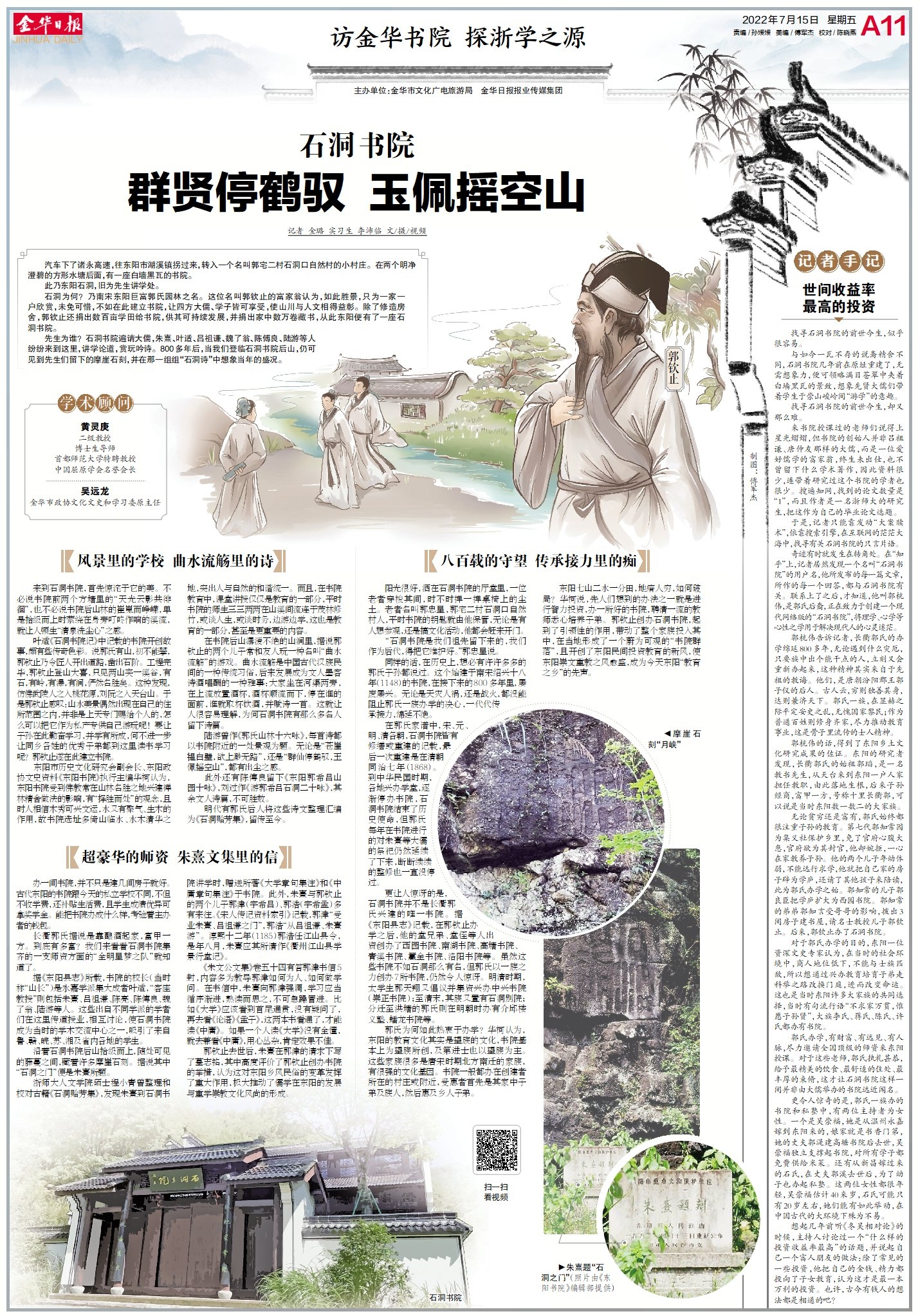 东阳七山二水一分田,地瘠人穷,如何破局?华柯说,先人们想到的办法之一就是进行智力投资,办一所好的书院,聘请一流的教师悉心培养子弟。郭钦止创办石洞书院,起到了引领性的作用,带动了整个家族投入其中,在当地形成了一个蔚为可观的“书院群落”,且开创了东阳民间投资教育的新风,使东阳崇文重教之风愈盛,成为今天东阳“教育之乡”的先声。