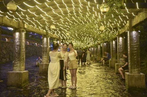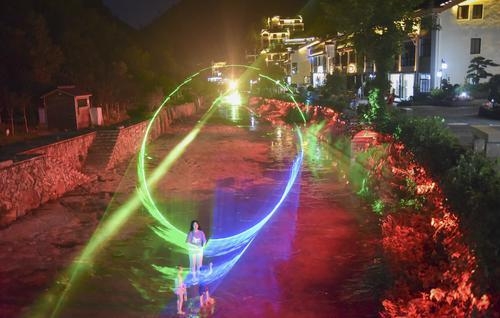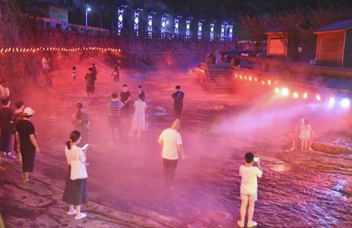 7月21日晚,游客在磐安县花溪风景区纳凉赏景。夜幕下的磐安县花溪风景区,利用声光电科技手段,打造一个虚实结合且富有花溪景区特色的沉浸式场景。