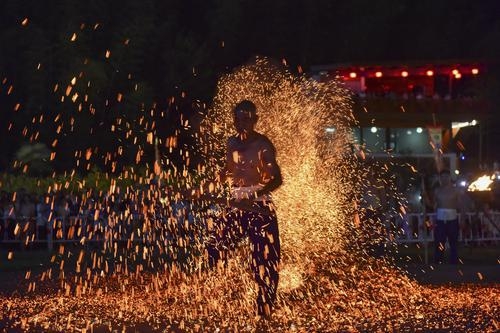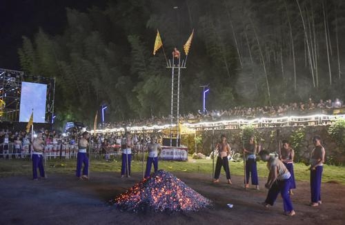 景区工作人员说,光脚踩在烧红的炭火上不被烫伤,炼火者除了勇气和胆量外,还要凭经验掌握恰当的火候,这也是炼火的神奇和神秘之处。
