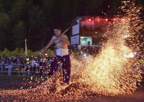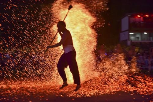 这两天,气温连续超过40℃,真的可以用骄阳似火来形容。但7月23日晚,磐安县花溪风景区举行“炼火”表演仪式,用40多箩筐木炭在平地上燃起直径1米多高的火坛,9名大汉赤着上身、光着脚,然后手持铲子围着一大堆烧得通红的木炭奔走穿梭,动作粗犷有力。9名大汉的敬业精神和专业素养让在场所有人忍不住点赞。