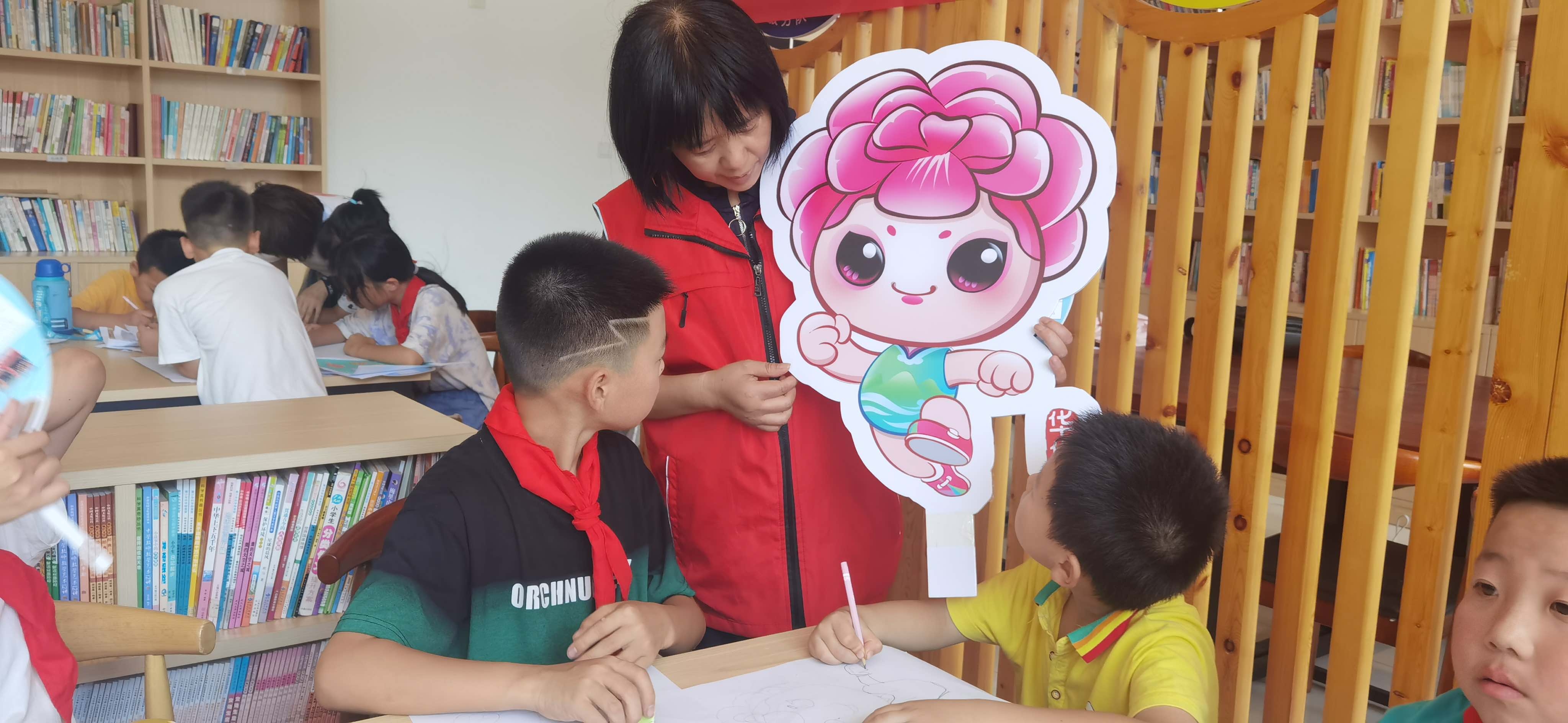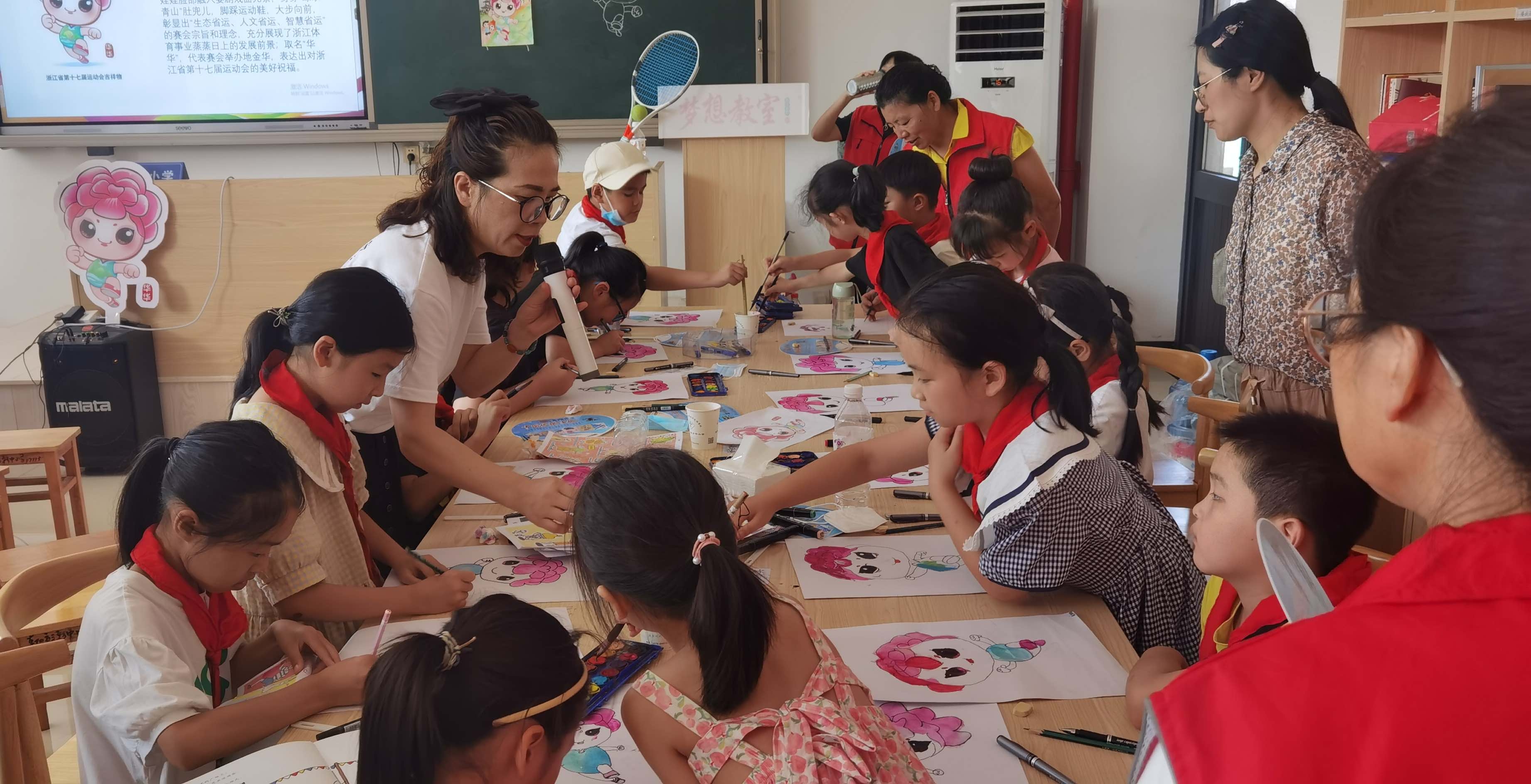 7月25日,正当第十七届省运会首场赛事街舞在金华正式开赛之际,东阳市三单乡的60多名山区留守困境儿童和回乡度假学生,与该乡共青团员、帮帮姐及“叶子帮帮”志愿者一起,在爱心画家的指导下,用一支支彩笔专心致志地画着省运会吉祥物茶花娃娃——“华华”和省运会创意招贴画。