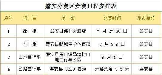 按计划,举重项目将于8月3至9日在县新城中学体艺馆举行,山地自行车项目将于9月4日在玉山古茶场茶园内山地自行车公园举行,公路自行车项目将于10月开幕式后第3—5天举行,场地设于S219省道溪口公园至大麦坞村路段。