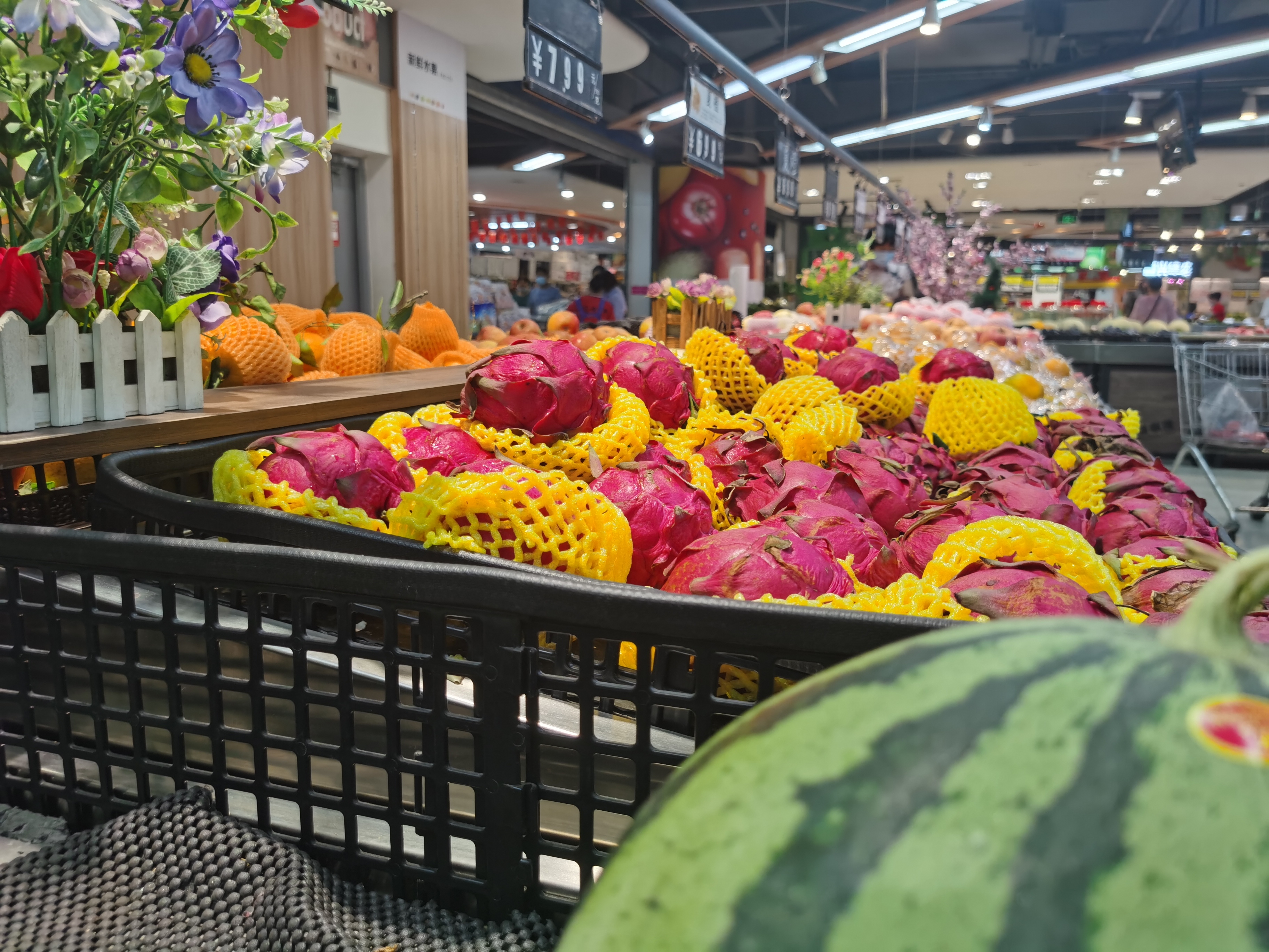 目前,市场主要在售水果有:西瓜(1元/斤~2.7元/斤),冬枣(5元/斤~18元/斤),桃子(2.7元/斤~12元/斤),李子(2.8元/斤~5.5元/斤),小台芒果(3.8元/斤~4.2元/斤),以及进口的榴莲(22元/斤~23元/斤),火龙果(4.5元/斤~5.5元/斤),椰子(90元~110元/箱)。
