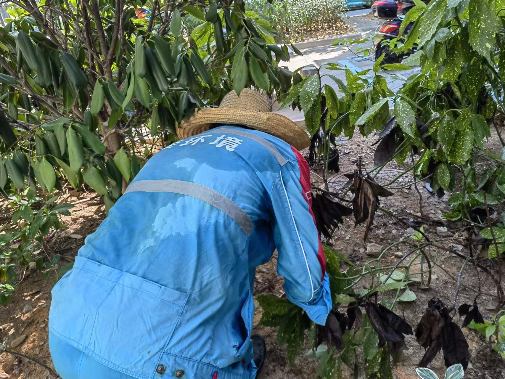 8月5日上午11时,金华新婺环境有限公司的几名保洁人员正在南苑西19幢房前屋后绿化带里清扫落叶。此时气温已经高达37摄氏度,每个人都汗流浃背,工作服也被汗水浸湿。