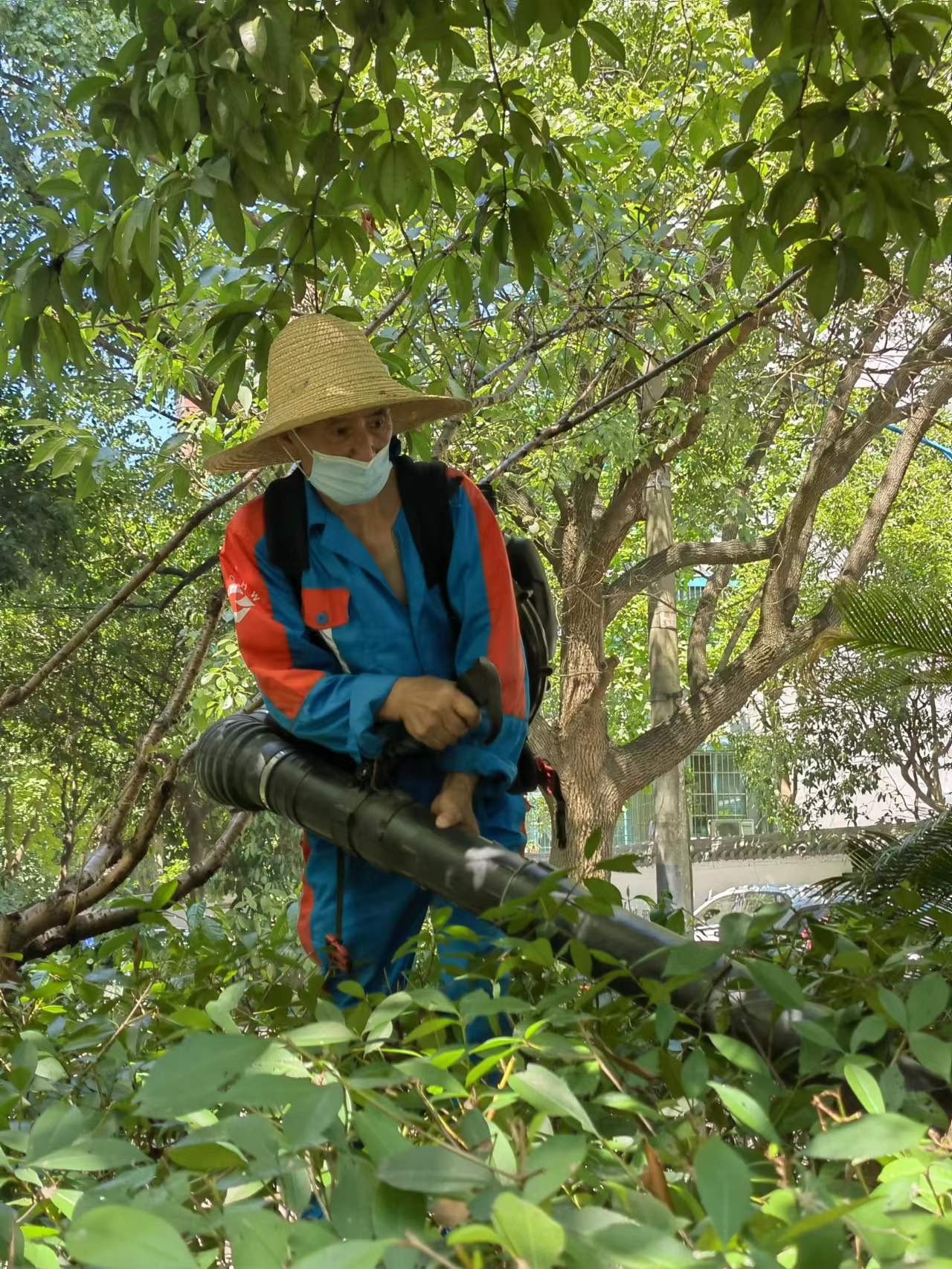 当天早上,徐建华师傅背着30斤重的鼓风机,负责将小区绿化带里的枯枝落叶清理出来。由于机器比较笨重,不好控制,落叶又比较轻盈,徐师傅一手扶着管子,一手拎着管子上的手柄控制好方向,将落叶往一个方向吹出来。其余工作人员则负责将落叶清扫、装袋。