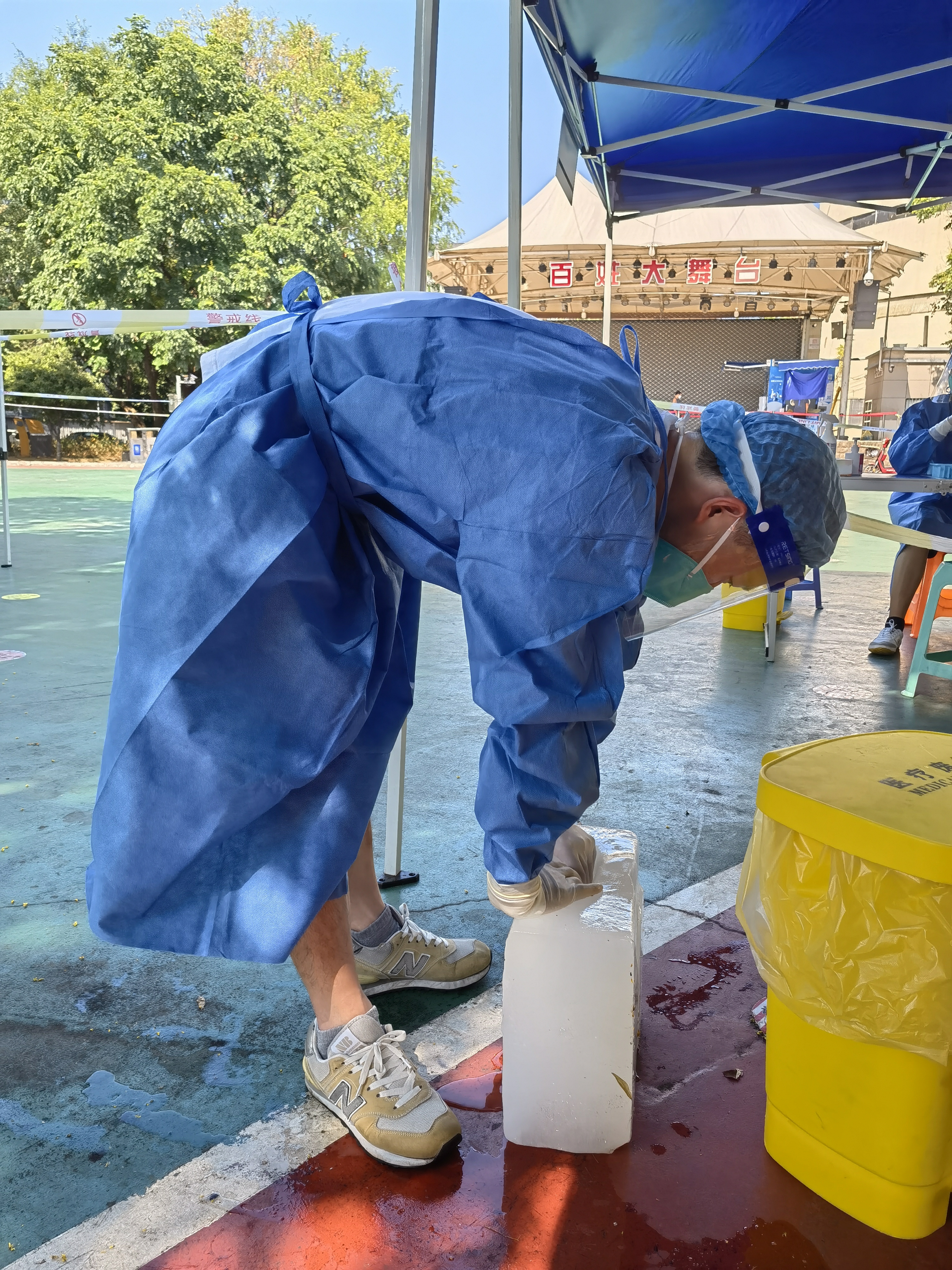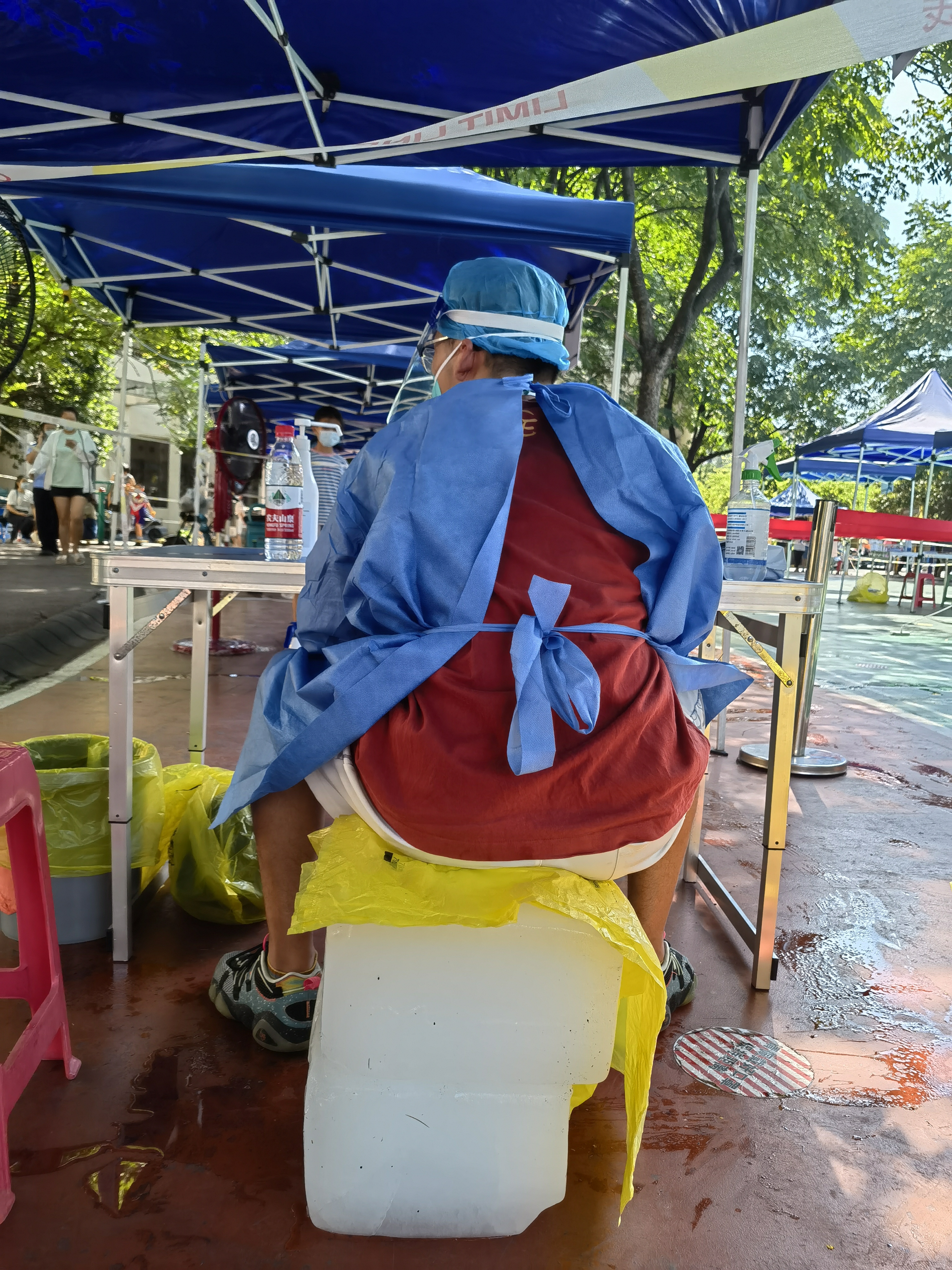 “昨天在湖海塘社区的滨江·金色蓝庭小区进行核酸采样,我们穿的都是厚厚的白色防护服,穿上感觉要中暑了,采样结束以后衣服都湿透了。今天穿蓝色防护服要稍微好一点,不过戴着医用隔离面罩依然很闷热。”肖辉奇说。