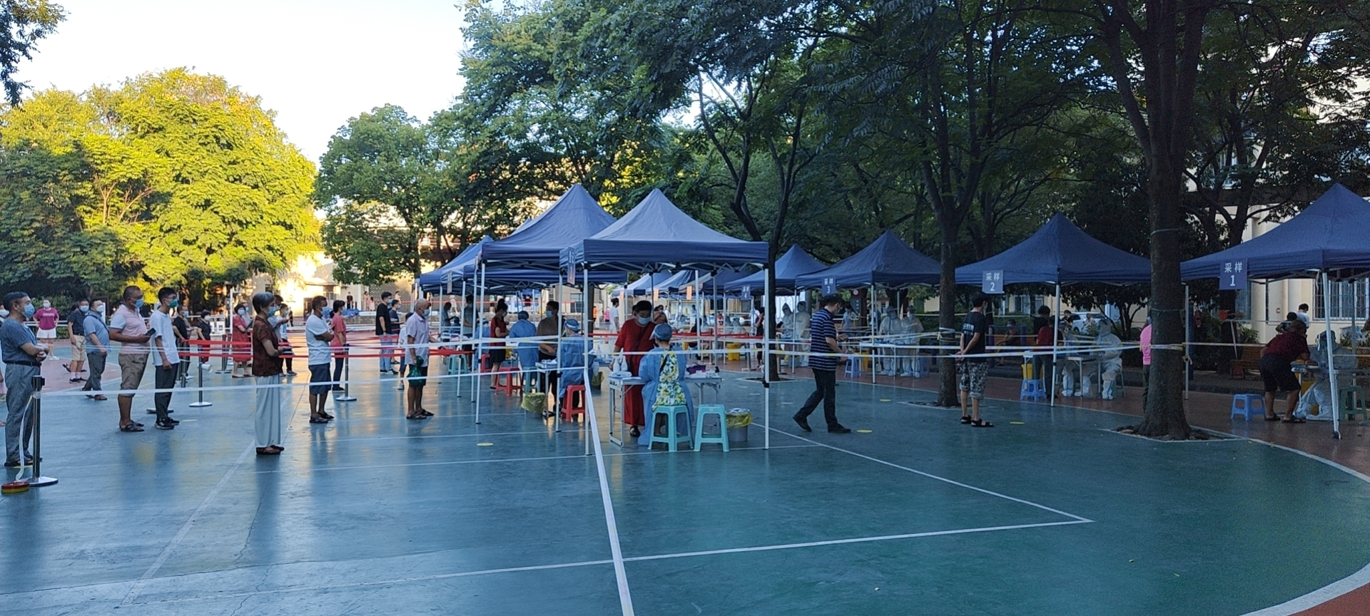 8月5日上午8时许,记者在江南街道广苑广场核酸采样点看到,社区居民戴着口罩有序排队,等候测温、扫码、核酸采样。穿着蓝色防护服的工作人员各司其职,保障核酸采样工作顺利进行。