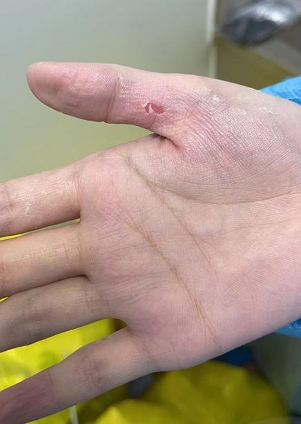 8月15日凌晨1时30分,基地依然灯火通明。这是接到义乌样本核酸检测任务后通宵作战的第5天。试剂准备区内,胡卓美、叶慧婷已经工作了三个小时,当天所有需要使用的检测试剂都由她们两人配制完成。为了不影响检测工作,两人在样本送到前就开始准备。根据当天的检测量,两人需要配制近350盒试剂,由于不停地拧试剂瓶盖,两人的手都起了大水泡。