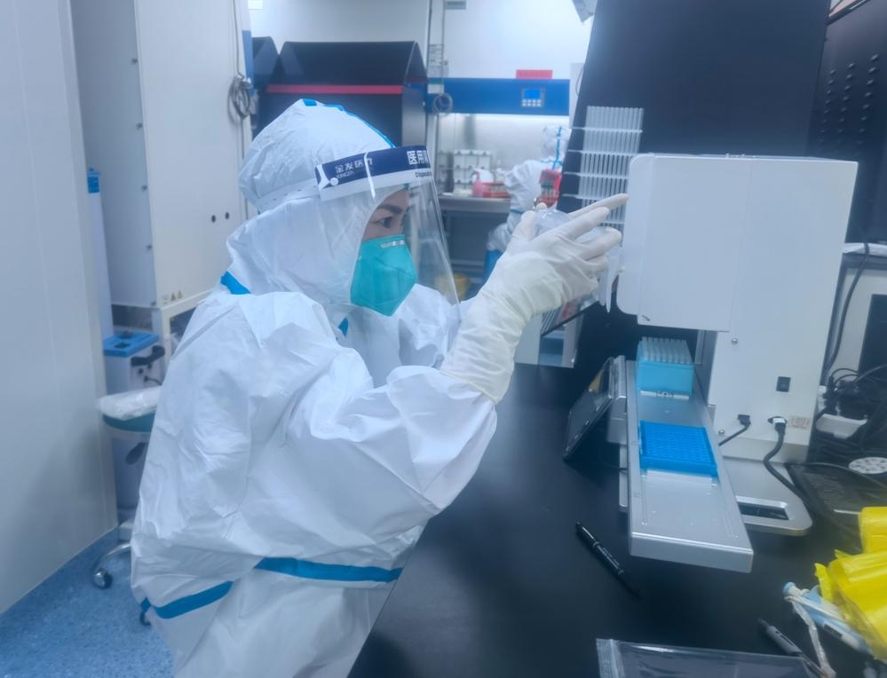 由于核酸样本检测工作强度大、节奏快,为了不耽误时间、节约防护服等资源,工作人员一投入工作,常常七八个小时后才走出实验室休息一会儿,喝水、吃饭、上厕所这些日常小事对她们而言显得格外不易。