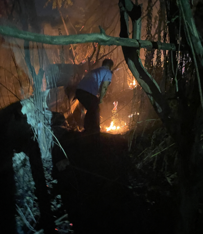 张灵辉和两名辅警调解完纠纷,在回所时路过金东区金瓯路,发现路边一处小山坡的树林里有一片红光在闪烁。由于近期持续高温,天干物燥,张灵辉十分敏感地想会不会有火情。于是,立即驱车靠近查看,果然是小树林里起火了,如不及时控制火势,很可能向整个小山坡蔓延扩大。