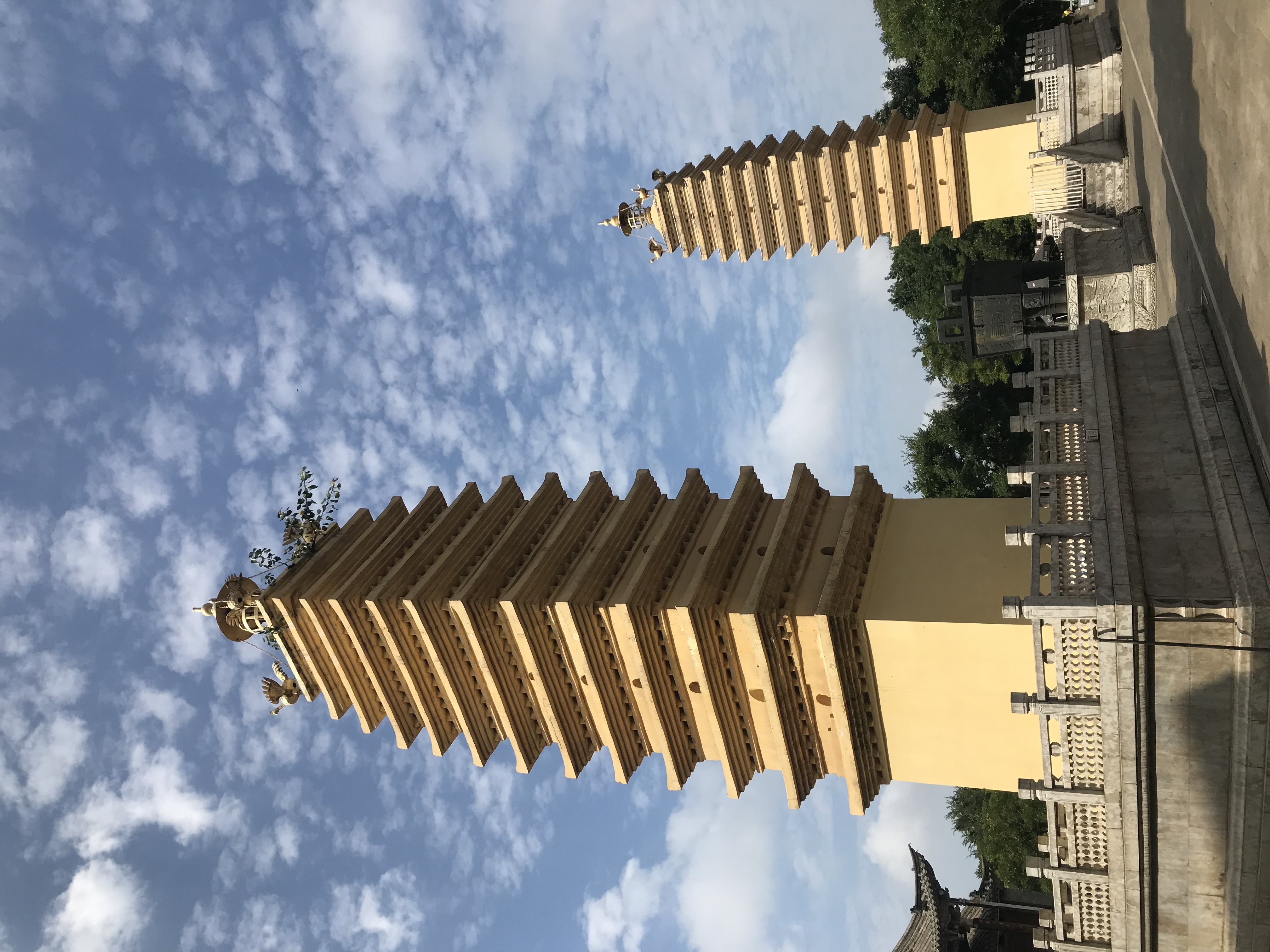 金刚塔前有一座古戏台,古戏台前面则是两座高17.4米的柠檬黄色13层实心密檐塔,方形砖砌,高耸入云,颇为壮观。这是妙湛寺双塔,一东一西,始建于元朝(1327—1335)年间,其中西塔1833年毁于地震,后重建。