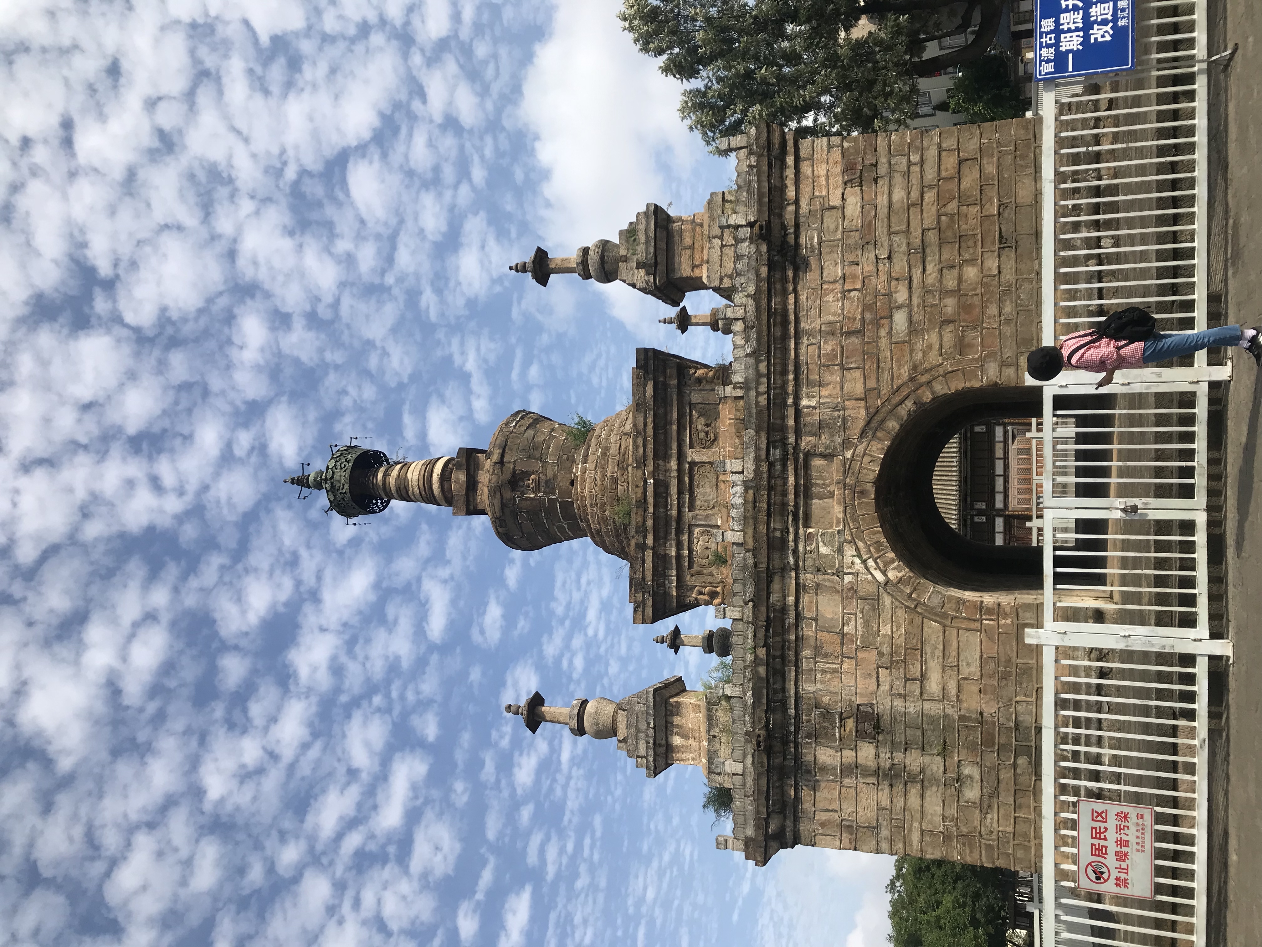 金刚塔塔座呈方型,东、西、南、北四道券门十字贯通,又称穿心塔。塔被围栏围着,无法体验穿过塔心的感受。塔座四角各有一座小塔,中间则是高16.05米的一座大塔。蓝天白云下,金刚塔显得古朴、庄重。由于它在我国现存十余座金刚塔中历史最悠久、保存最完整,有重要的历史文化和艺术价值,现为全国重点文物保护单位。