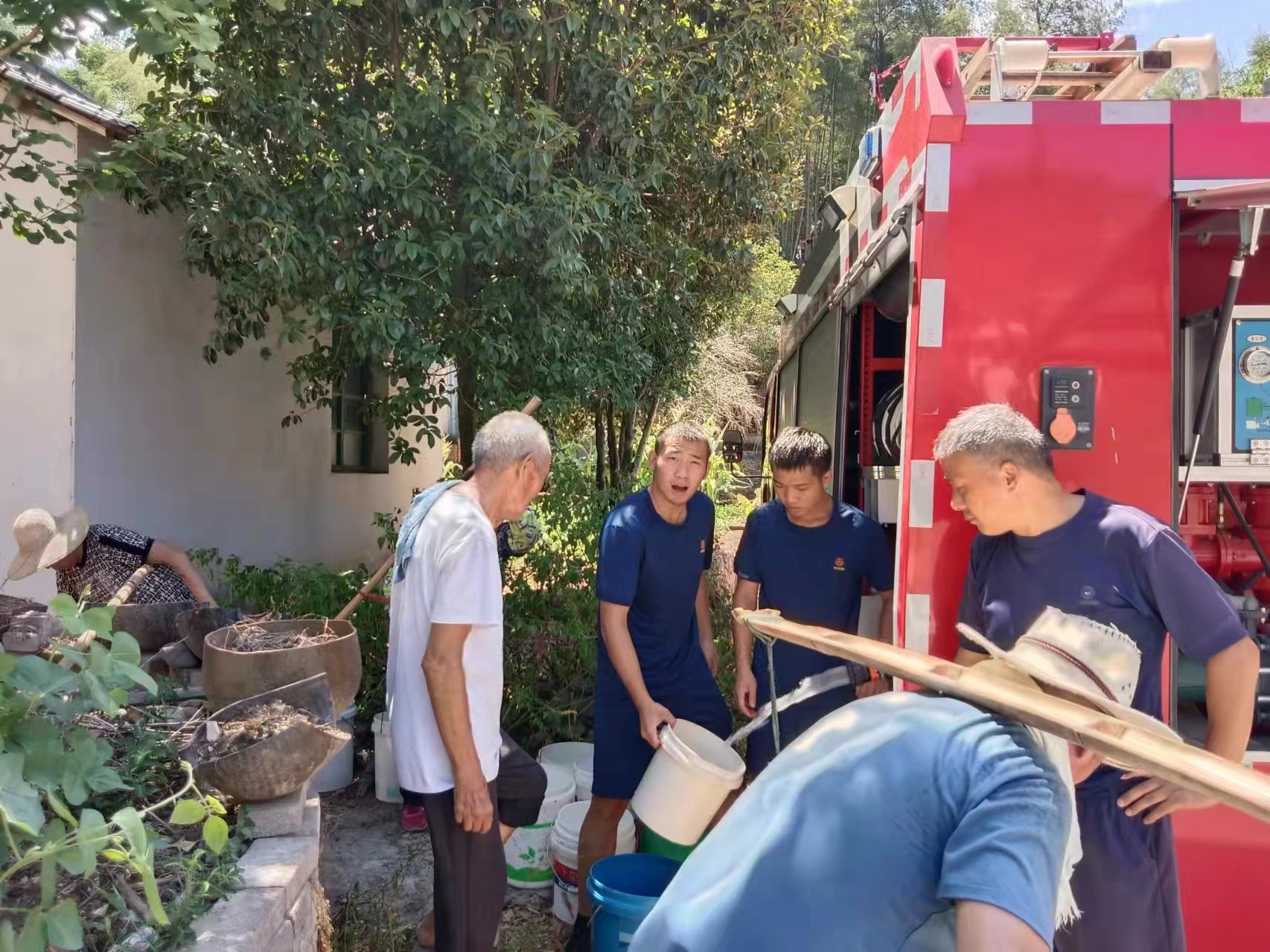 “天气这么炎热,他们不仅帮忙送水上山,还帮行动不便的老人挑水,真的很辛苦,非常感谢。”小同村党支部书记吴芳金告诉记者,因连续的高温天气,小同村单村供水的自来水出现缺水问题,消防车就当起了送水车,这已经是本月第二次送水来了。