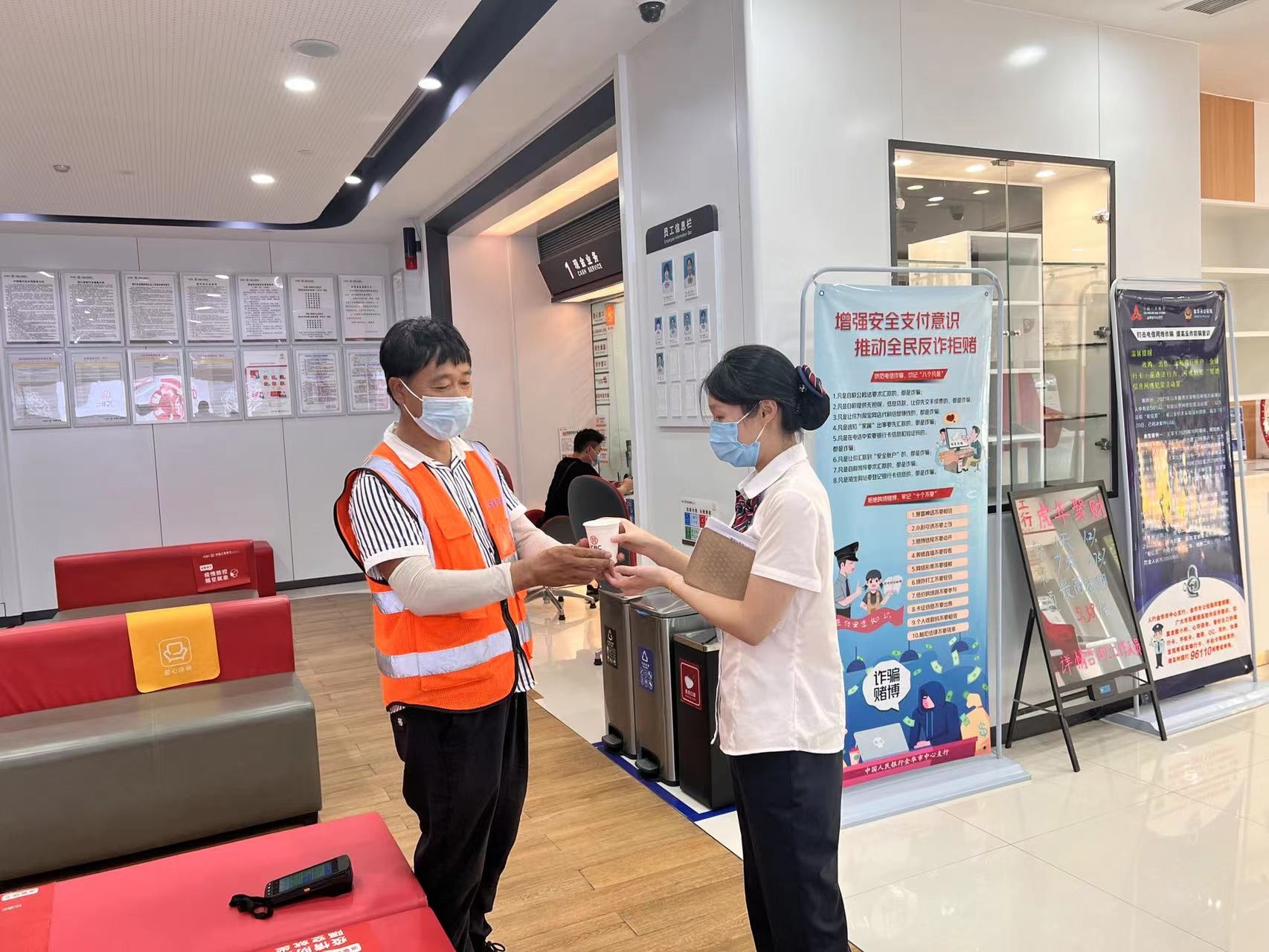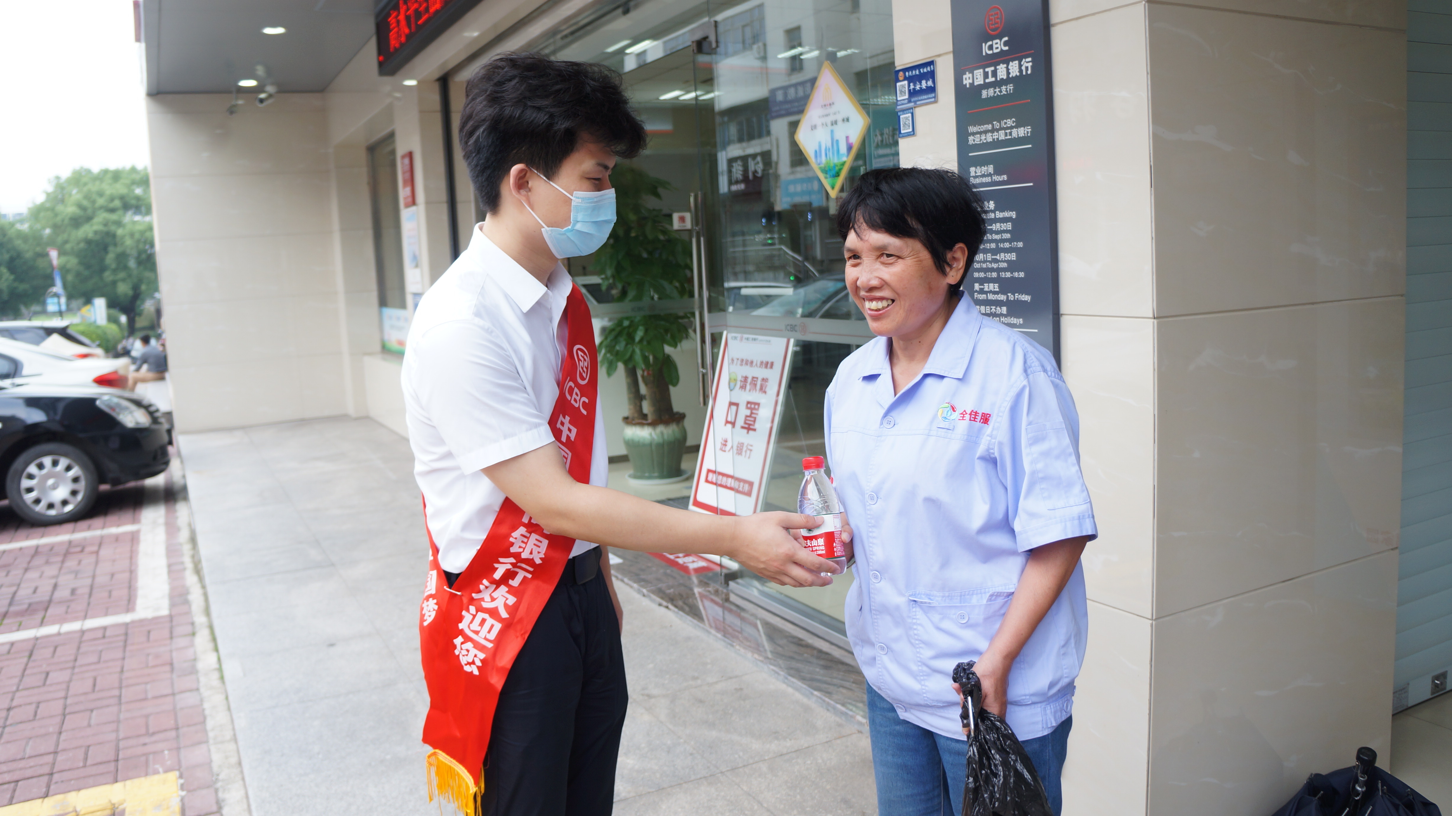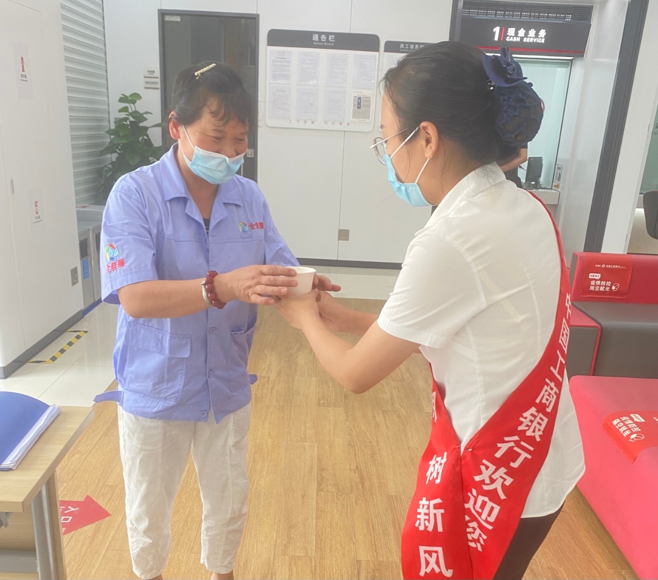 “感谢工行为我们提供茶水”两位走入金华工行营业厅的环卫工人如是说到。