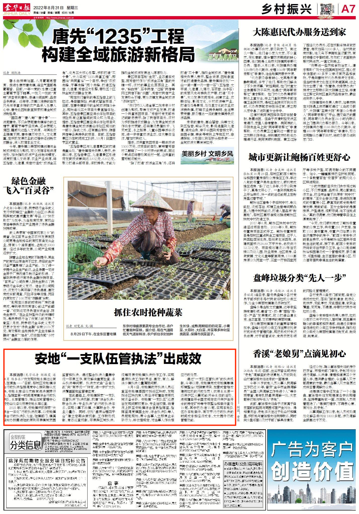 在此基础上,安地镇又积极探索“一支队伍管执法”的执法机制,构建“综合执法+联合执法+专业执法”的行政执法体系,实现小事不出镇、大事联合办、专业力量办。